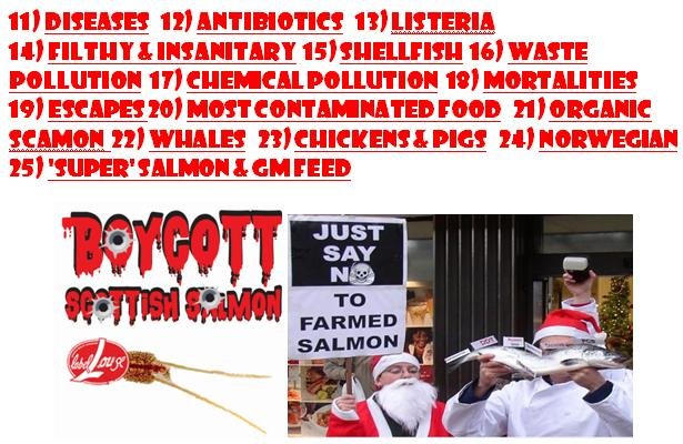 25 Reasons to Boycott Scottish Salmon March 1, 2017 Download report in full as a PDF online here Read more via: Letter to French Government: "Label Rouge Saumon Ecossais – Quelle Horreur!" Protest in Edinburgh – 16 March "Red Alert for Label Rouge – Lousy Label Goes Rogue" Press Release: "Toxic Toilets: Salmon Farms Pollute Scotland's Lochs" Press Release: "Failing Fish Farms – 18% rated "poor" by SEPA in 2015" Front Page of Sunday Herald: "Revealed: Scandal of 45 Lochs Trashed by Pollution" "Celebrate" 25 years of "international success of Scottish salmon"?! Press Release: "Antibiotic-ridden Scottish salmon" Press & Journal: "Fish 'hooked on chemicals'" Dounie Bay Swims Against the Tide of Salmon Farming