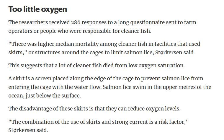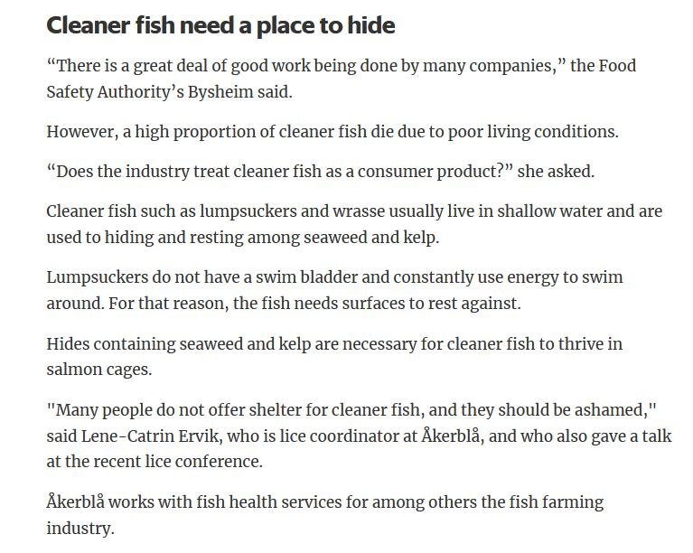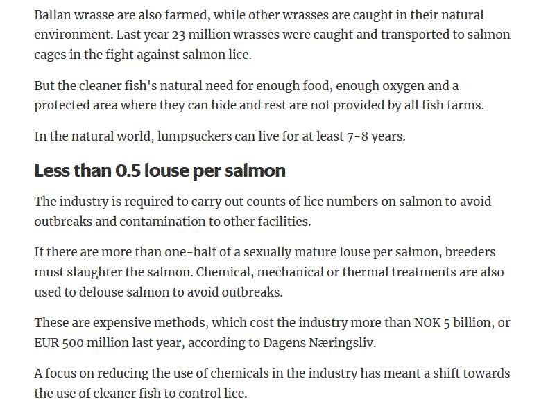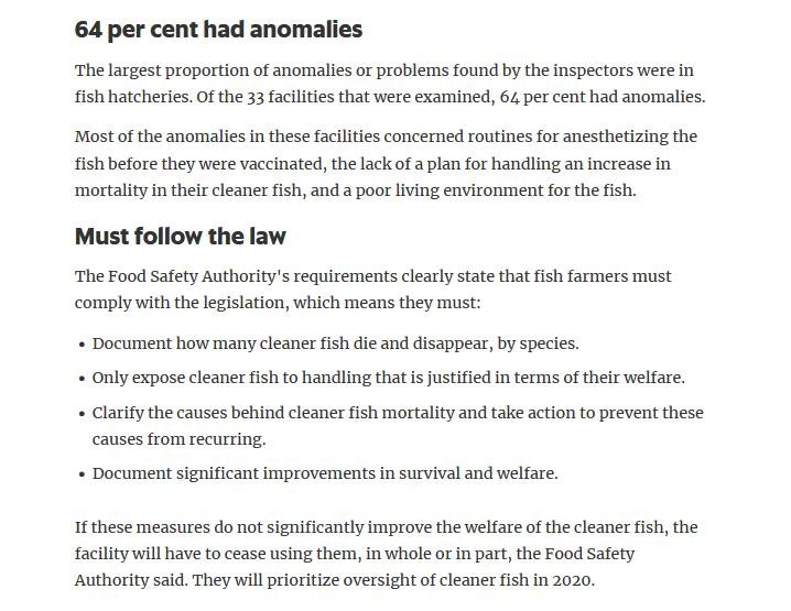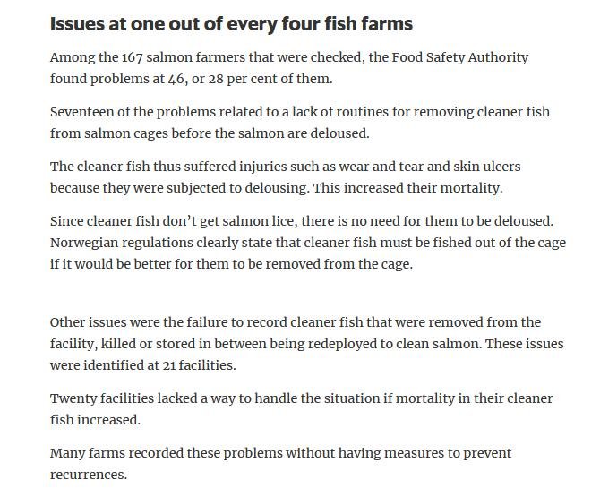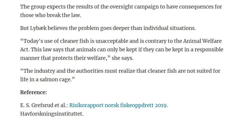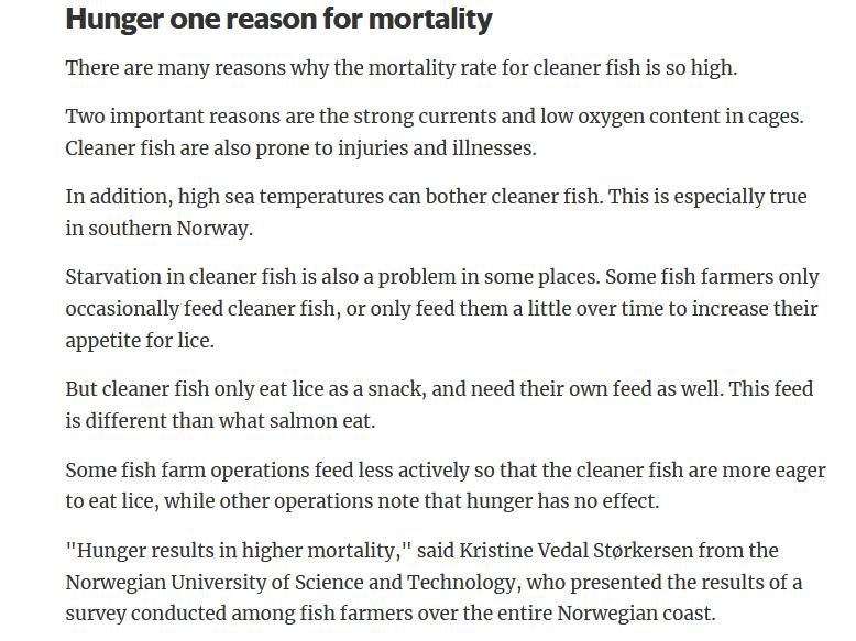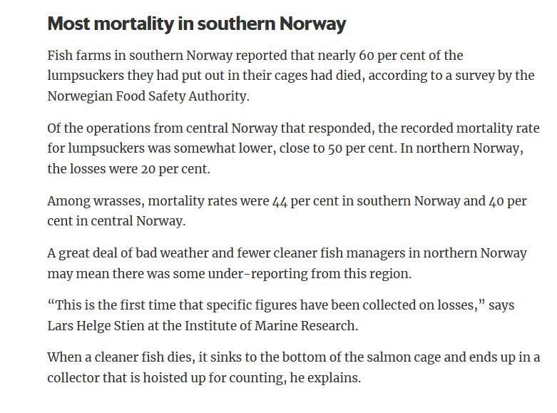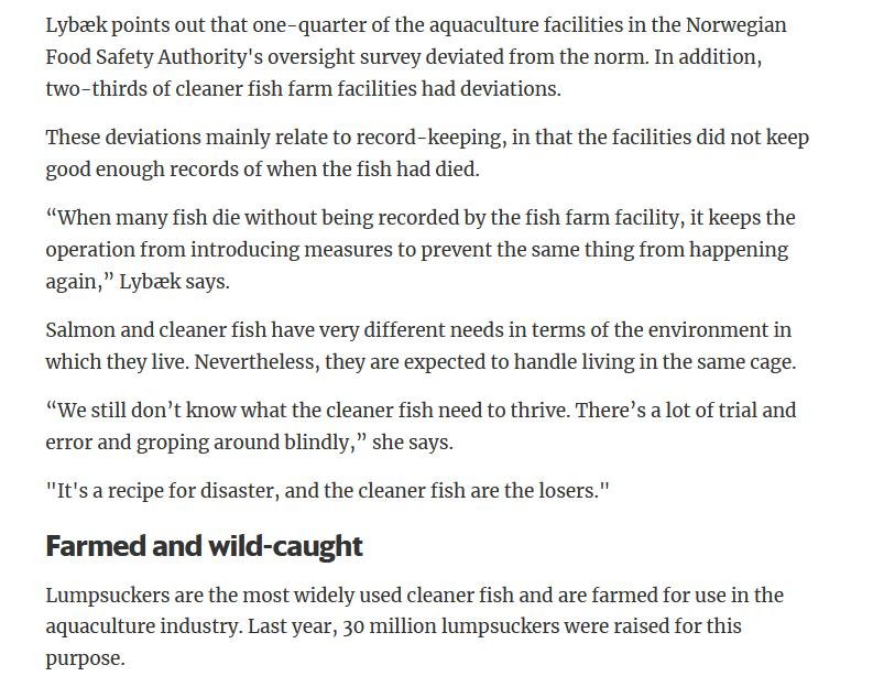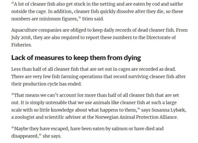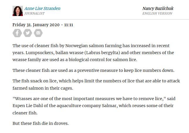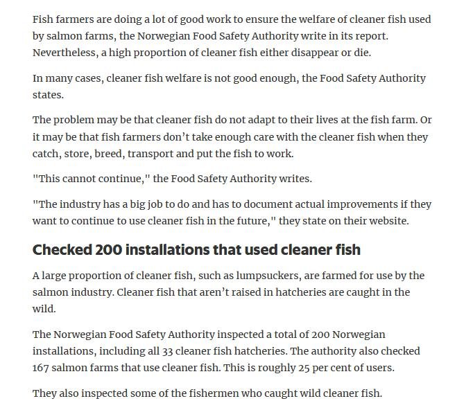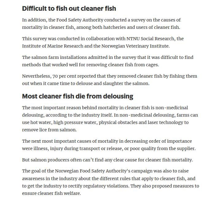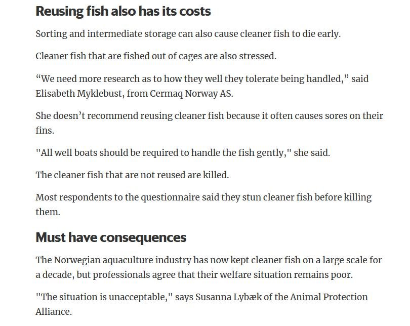 Welfare abuse of cleaner fish on salmon farms is not just a problem in the 'Scottish' industry (ca. 80% of salmon farming in Scotland is controlled by Norwegian salmoney including the Norwegian Government who is the primary or secondary shareholder in Mowi, Scottish Sea Farms (via SalMar and Leroy), The Scottish Salmon Company and Grieg Seafood). Science Norway reported in January 2020: