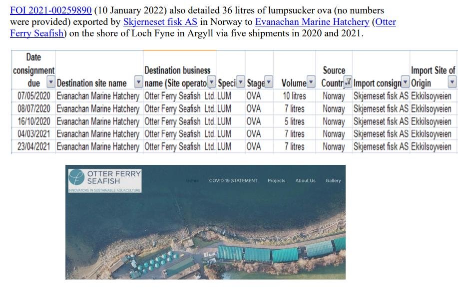 Further trade data disclosed by the Scottish Government via FOI in January 2022 revealed that Otter Ferry in Argyll imported 36 litres (no numbers were provided) of lumpsucker ova (eggs) from Norway in 2020 and 2021: