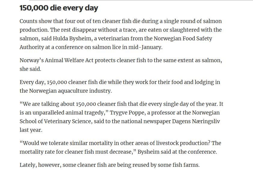 Norway's Financial Times (Dagens Naringsliv) reported in December 2019 that 150,000 cleaner fish died every day on salmon farms in Norway with 50-60 million fish dying each year: