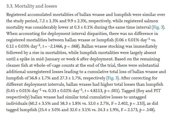 A scientific paper published in the journal Aquaculture in November 2020 – by the same Norwegian research team – reiterated the extremely high mortality data reporting 57% mortality in wrasse and 27% in lumpfish on salmon farms:
