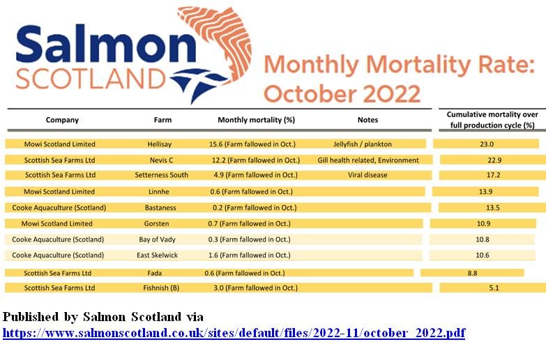 Mortality data published on 9 November 2022 by Salmon Scotland detailed mortality data for September 2022 headed by RSPCA Assured Loch Duart in Loch Carnan with 55.9% (when Loch Duart come round to harvesting out Loch Carnan there will be very few fish left!):