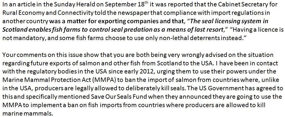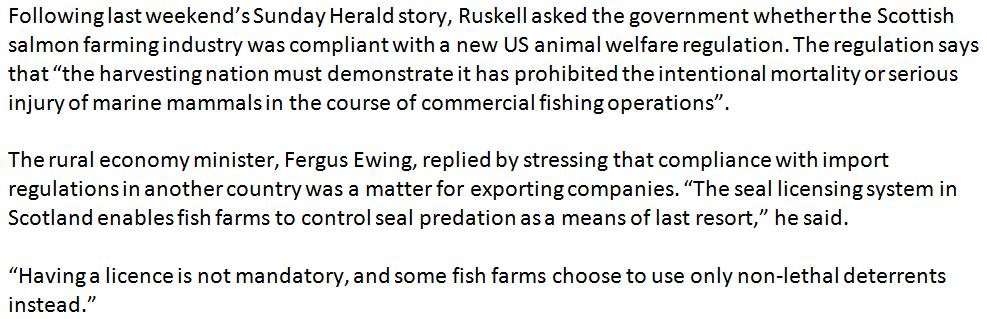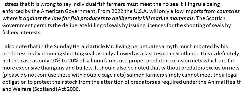 Fergus Ewing is not alone in misinterpreting the new U.S. rules – the Scottish Salmon Producers Organisation (SSPO) is under the misguided impression that the killing of seals complies with the Fish and Fish Product Import Provisions of the Marine Mammal Protection Act.   The West Highland Free Press reported (16 September 2016):
