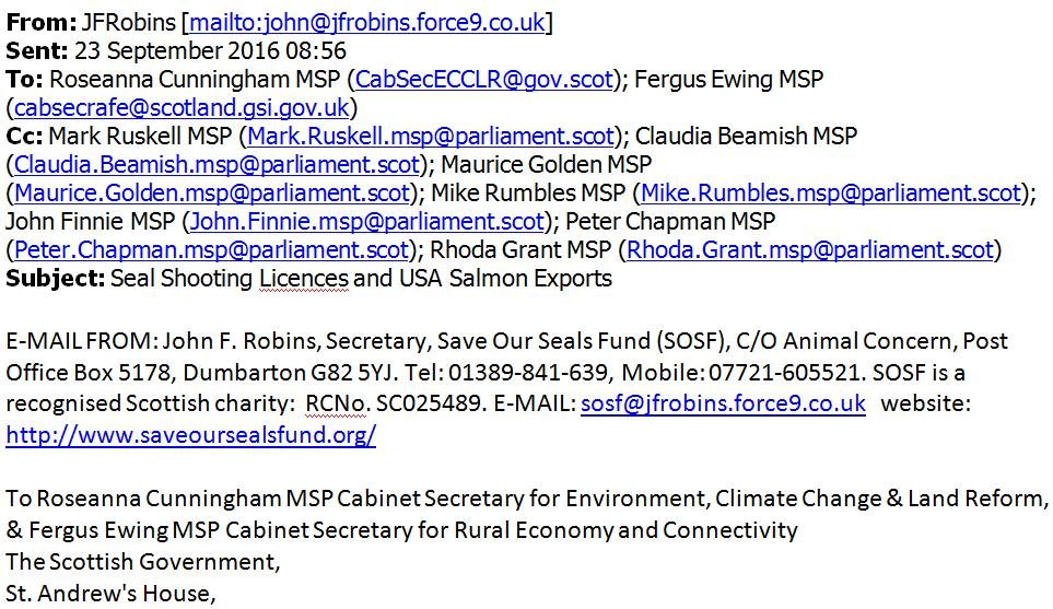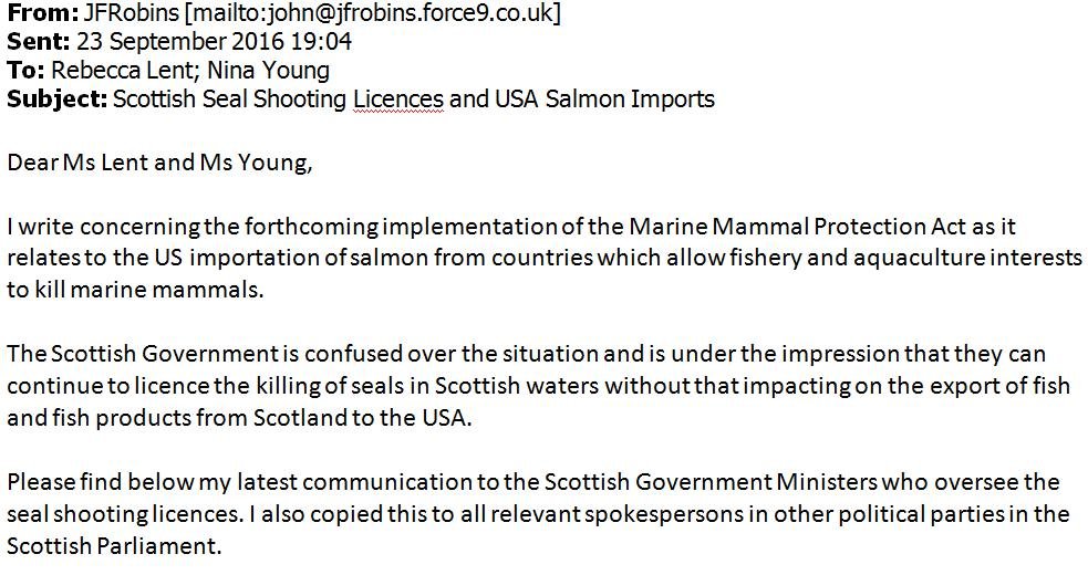 Scotland's 'blasé' attitude to an import ban on Scottish salmon was the subject of emails sent last week by John Robins of Save Our Seals Fund to both the U.S. and Scottish Government:
