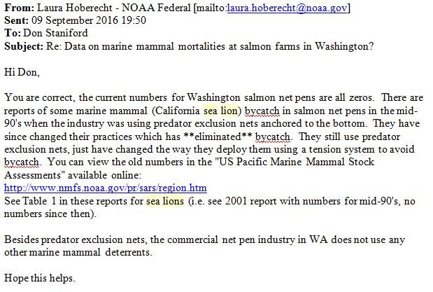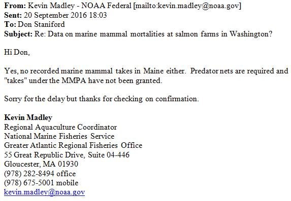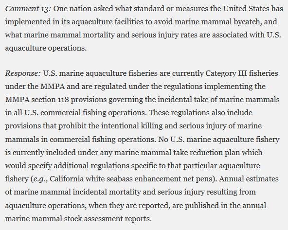 Note that the U.S. Government has confirmed to GAAIA that zero marine mammals are killed by salmon farms in the United States (Maine & Washington) meaning that the U.S. standard for importing nations is zero: