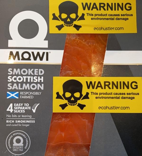 And here's some more honest packaging which showcases how some people would rather flush farmed salmon down the toilet rather than eat it: