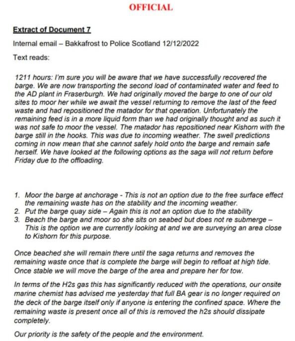 Police Scotland's FOI disclosure on 19 December 2022 detailed an Anaerobic Digestion facility in Fraserburgh as the waste disposal route with the Viking Saga wellboat acting as courier for the contaminated cargo: