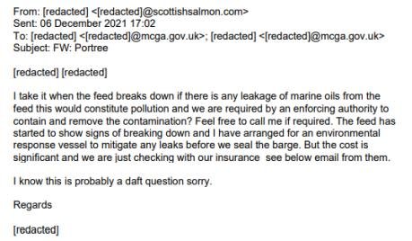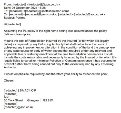 A Freedom of Information disclosure by the Scottish Government also detailed emails between Bakkafrost (The Scottish Salmon Company) and their insurance company AON in Glasgow: