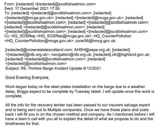 Cc: <dougie.macleod@scottishsalmon.com>, Briggs Marine <enquiries@briggsmarine.com>, <h.smith@marinemasters.nl>, <d.spaans@marinemasters.nl>, <operations@marinemasters.nl>, <info@bonn-mees.com>, <aliyah.zaidi@aon.com>, <colin.mayes@aon.com>, <mediainquiries@aon.com>, <sales@gaelforcegroup.com>, <folketrygdfondet@ftf.no>, <Nils.Bastiansen@ftf.no>, Marika Burvald <marika.burvald@ftf.no>, <Kjetil.Houg@ftf.no>, <stockwatch@oslobors.no>, <clsegurlund@euronext.com>, <rennie@gaskfarm.co.uk>, John Finlayson (Councillor) <john.finlayson.cllr@highland.gov.uk>, Forbes K (Kate), MSP <Kate.Forbes.msp@parliament.scot>, Ian Blackford <ian.blackford.mp@parliament.uk>, Sarah Walker <Sarah.Walker@mcga.gov.uk>, HM Coastguard <HMCoastguard@mcga.gov.uk>, Stan Woznicki <Stan.Woznicki@mcga.gov.uk>, Media <publicrelations@sepa.org.uk>, Alex Turner <Alex.Turner@nature.scot>, Drew Millar (Councillor) <Drew.Millar.cllr@highland.gov.uk>, Calum Munro (Councillor) <calum.munro.cllr@highland.gov.uk>, Ruraidh Stewart (Councillor) <Ruraidh.Stewart.cllr@highland.gov.uk>, <Chris.Birt.cllr@highland.gov.uk>, <isabelle.campbell.cllr@highland.gov.uk>, <Liz.Kraft.cllr@highland.gov.uk>, <Patrick.Logue.cllr@highland.gov.uk>