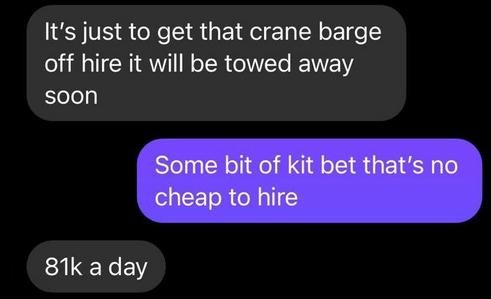 Subject: £1 million + salvage costs – £81K per day crane hire for GaelForce feed barge salvage operation?