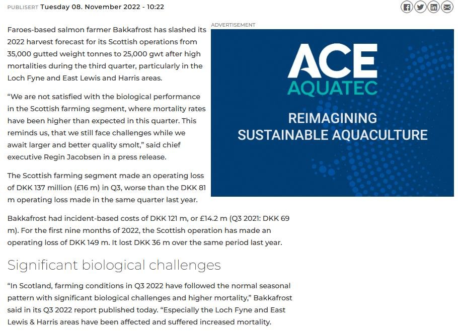 Investors in beleaguered Bakkafrost Scotland (formerly called The Scottish Salmon Company) must be choking on their 'responsibly sourced' RSPCA Assured Scottish salmon as news of further losses rack up. Fish Farming Expert reported (8 November 2022):