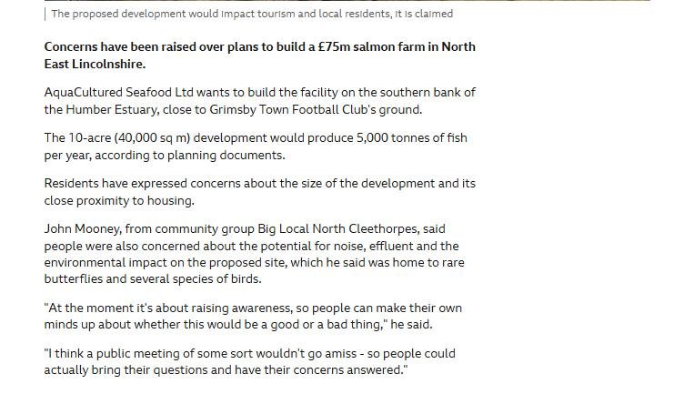 BBC News: “Concerns over plans for £75m salmon farm in Cleethorpes” February 16, 2023 BBC News reporting on plans for a 5,000 tonne salmon farm – the UK's largest in Cleethorpes next to @officialgtfc @BBCLookEast @BBCRadioLincs @NELCouncil https://t.co/9LcMU5FsRB — Don Staniford (@TheGAAIA) February 16, 2023 BBC News reported (15 February 2023): Read more via: Grimsby Telegraph: "Residents' fury at plan for £75m salmon farm in Cleethorpes" Fishy Filings at Companies House Flush Out Owners of AquaCultured Seafood – including $almafia Spy Craig Anderson! UK's Largest Salmon Farm Makes Splash in Trade Press! Grim Warning over UK’s Largest Salmon Farm – £75 million proposal to farm 5,000 tonnes of fish next to Grimsby FC spawns community backlash!