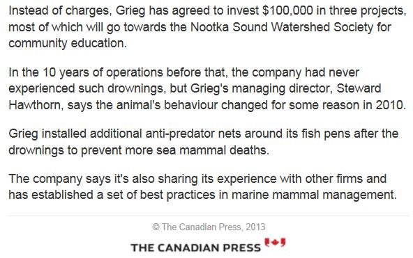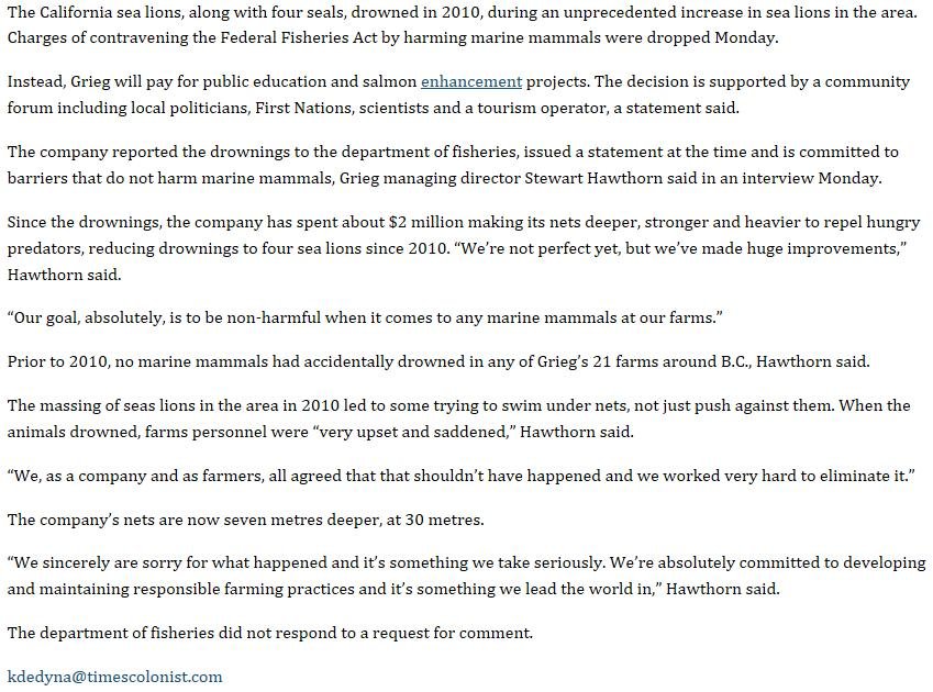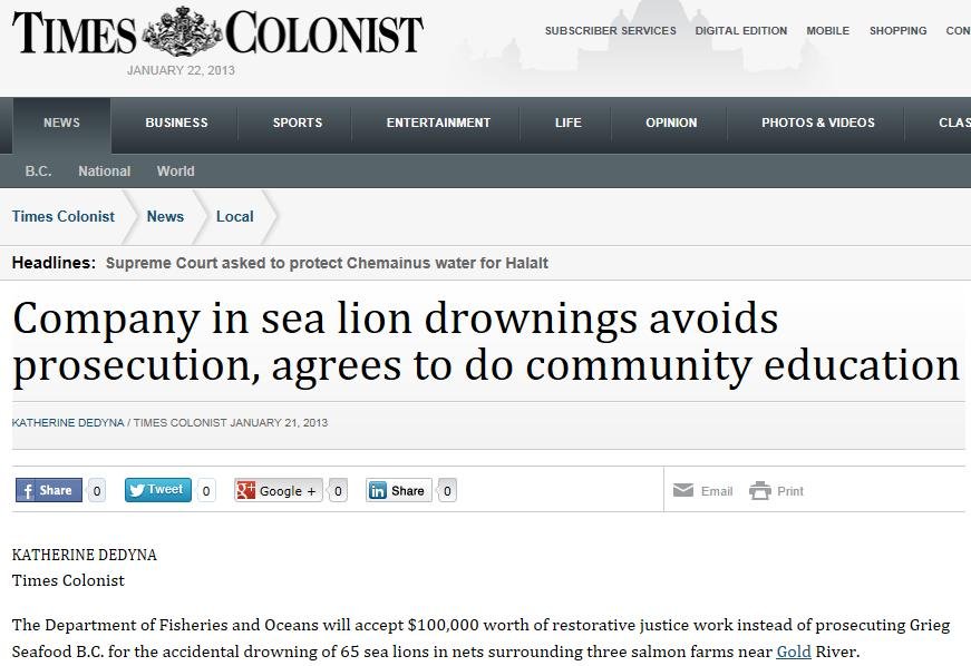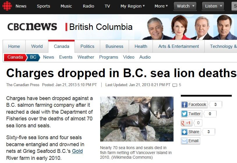The Norwegian-owned Grieg Seafood has blood on their hands in Canada after paying $100,000 to avoid charges for the killing of 65 sea lions and four harbour seals in British Columbia. CBC News & The Canadian Press report (21 January):