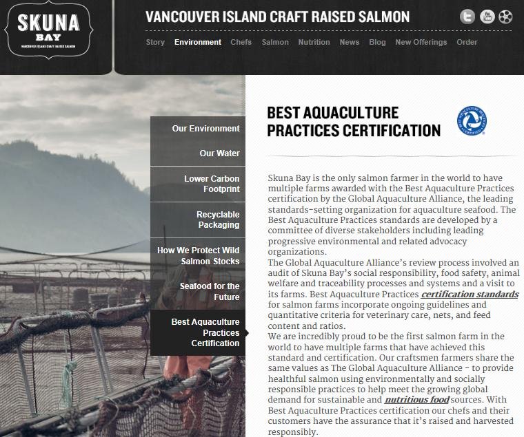 Grieg Seafood promote their B.C. farmed salmon via the Skuna Bay brand which promises "impossibly high standards". Skuna Bay's web-site claims that it is certified via the Global Aquaculture Alliance's 'Best Aquaculture Practices' which audits "animal welfare".