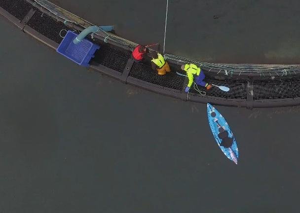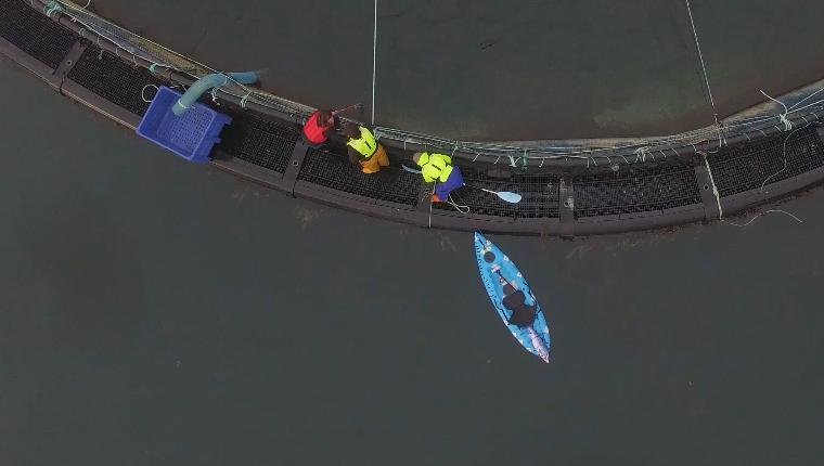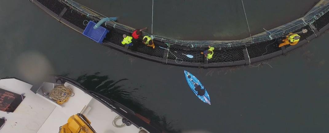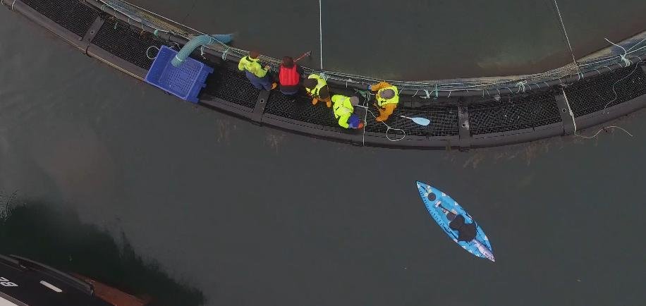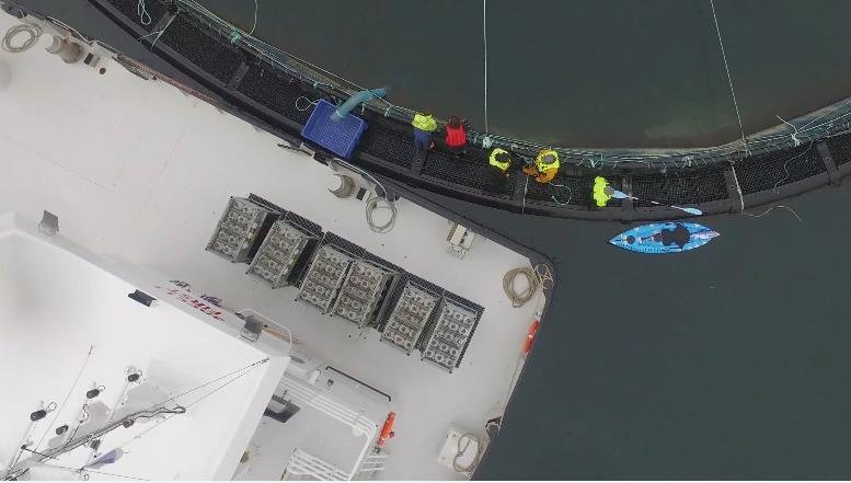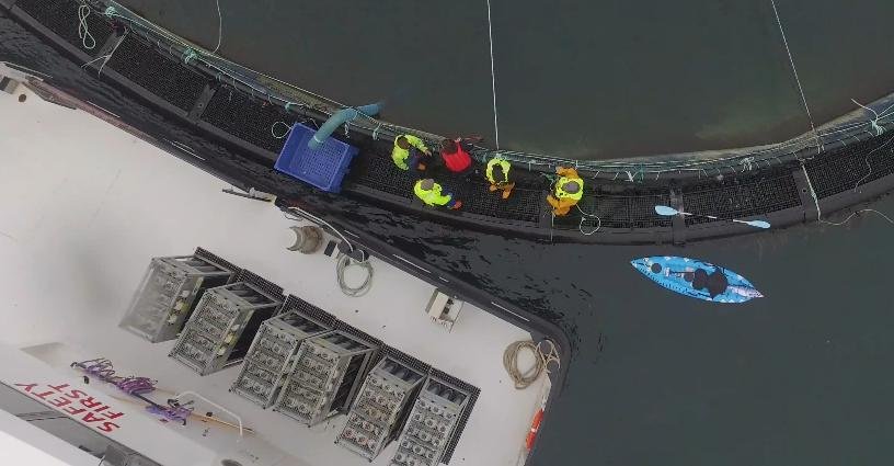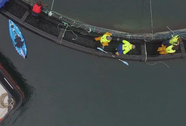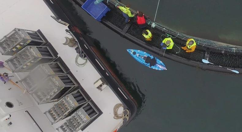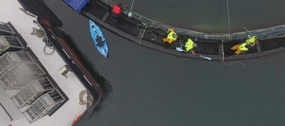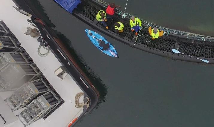 The kayak floats along the cage as the Mowi worker seems to be beckoning the work boat to smash it against the farm: