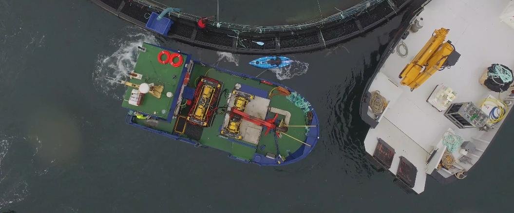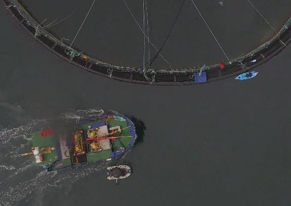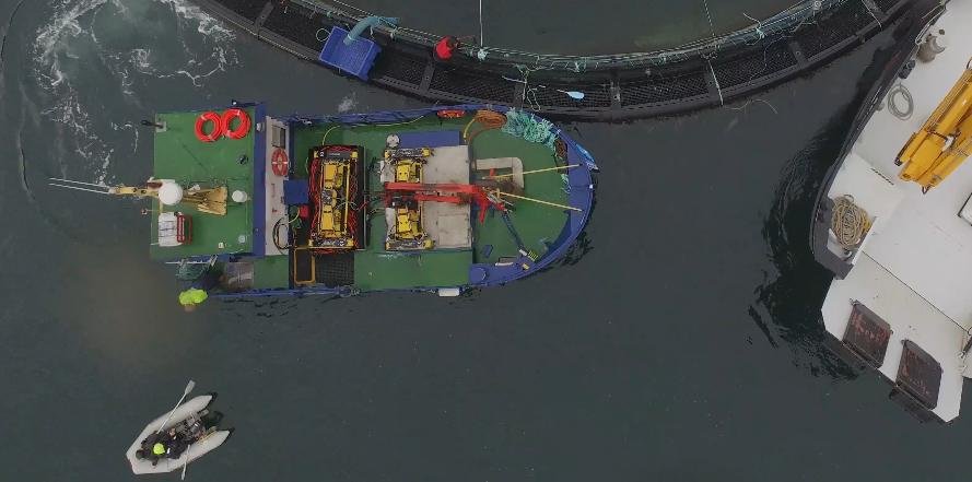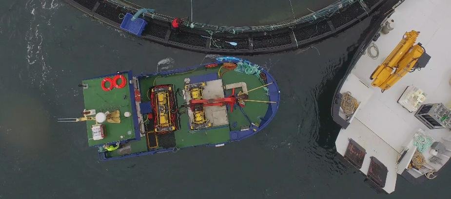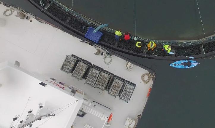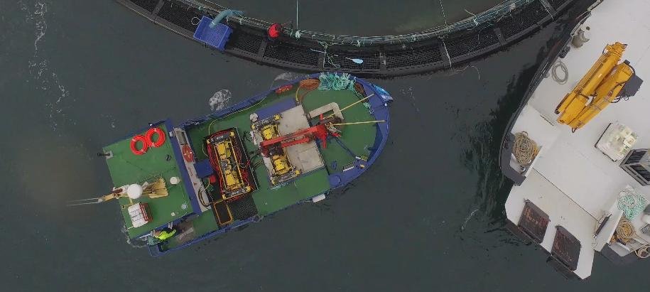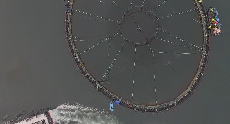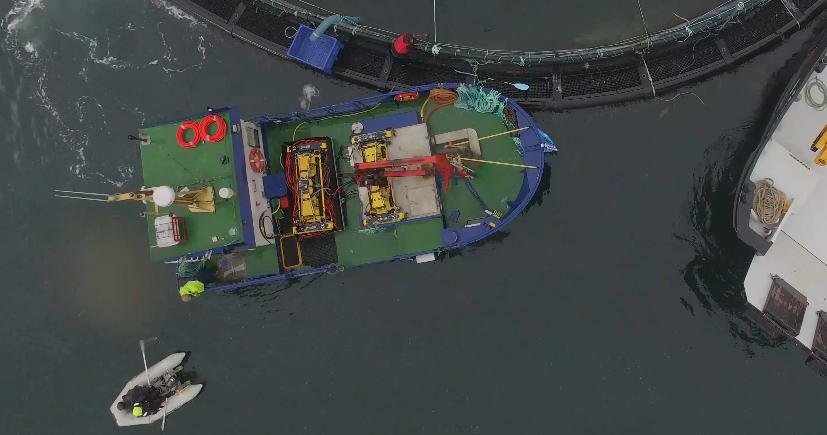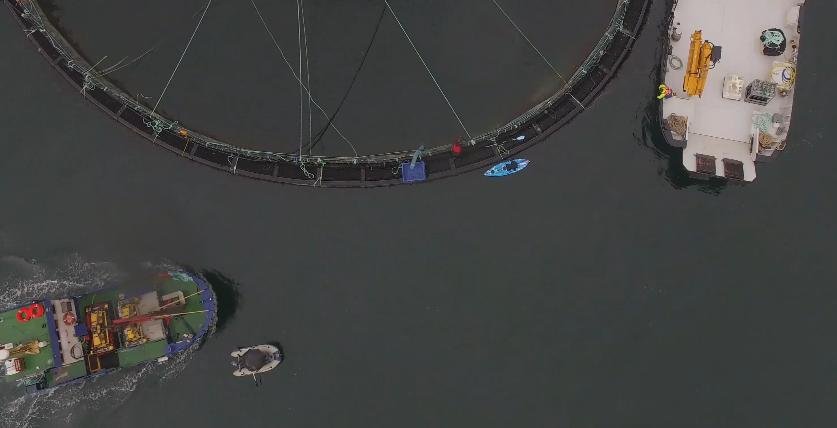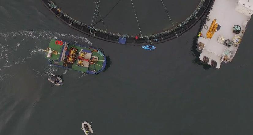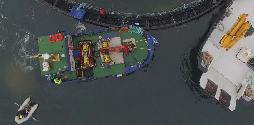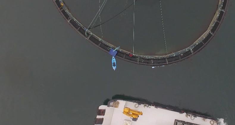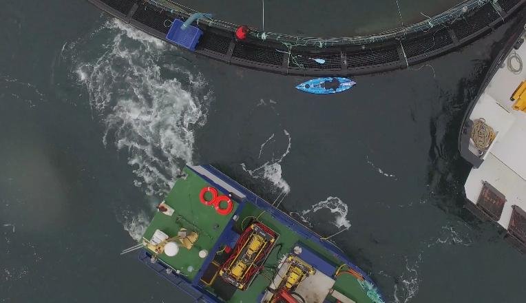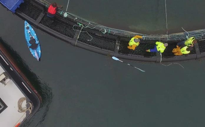 Here's photo stills grabbed from drone video footage taken ca. 8am on 2 November 2019 at Mowi's Ardintoul salmon farm in Loch Alsh (drone footage has been shared with the Health & Safety Executive and the Maritime & Coastguard Agency):