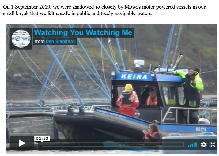 "Drone footage clearly shows that Mowi endangered the health and safety of the general public during an inspection of a salmon farm in Loch Alsh 'Special Area of Conservation'," wrote Don Staniford, Director of Scottish Salmon Watch.  "Mowi staff deliberately rammed a kayak, drove at high speed past a small dingy, unclipped a kayak tied safely to the farm, kicked a paddle into the water and scraped a work boot down my Achilles tendon.  Mowi's behaviour on 2 November at Ardintoul was both reckless and dangerous.  Since Scottish Salmon Watch plans further unannounced site inspections and sampling near salmon farms it is a hoped that a protocol can be put in place urgently to properly police surveillance of this unhealthy and unsafe industry."