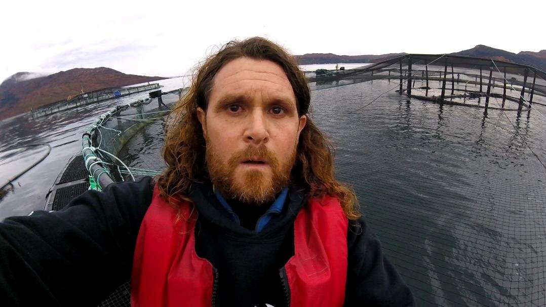 When the Mowi worker fails to kick the paddle into the loch he moves to try for a second attempt (as a Mowi work boat emblazoned with the words "Safety First" docks alongside the cage).  He appears to stop and looks up at the drone filming his every move: