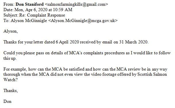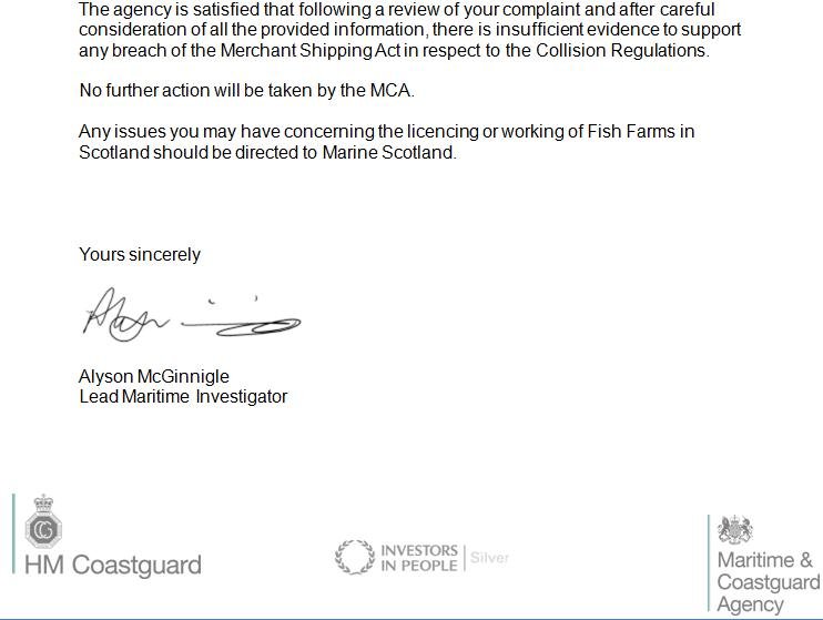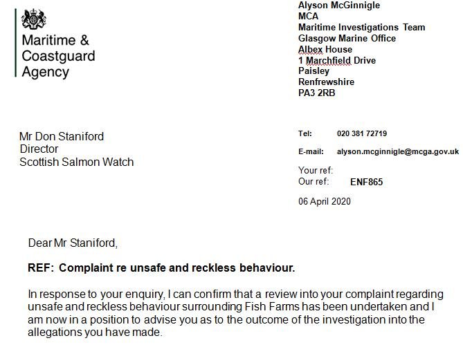 On 31 March 2020, the Maritime & Coastguard Agency finally replied to Scottish Salmon Watch's complaint dated 15 November 2019: