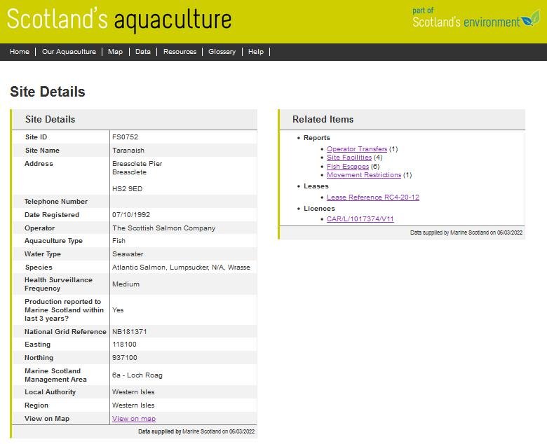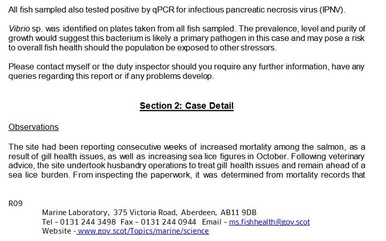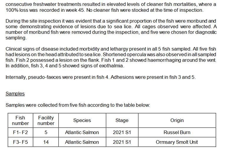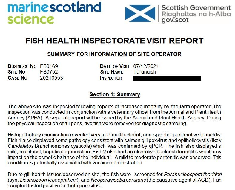 Here's the Fish Health Inspectorate Visit Report dated 25 January 2021 which reports 100% cleaner fish mortality at The Scottish Salmon Company's Taranaish salmon farm in Loch Roag on the Isle of Lewis – as well as a host of infectious diseases, pathogens and viruses (as well as antibiotic resistance) in farmed salmon: