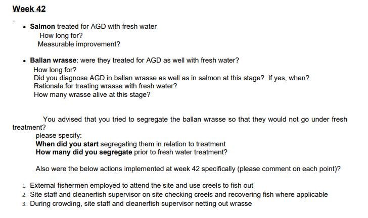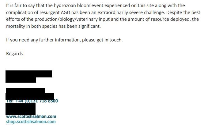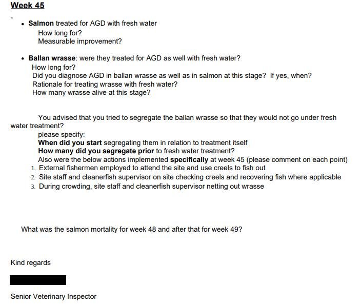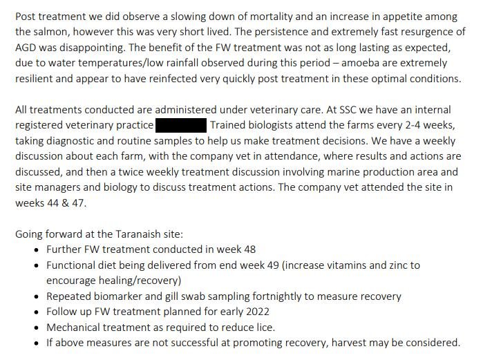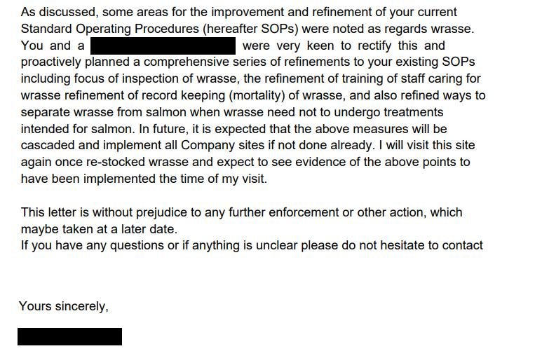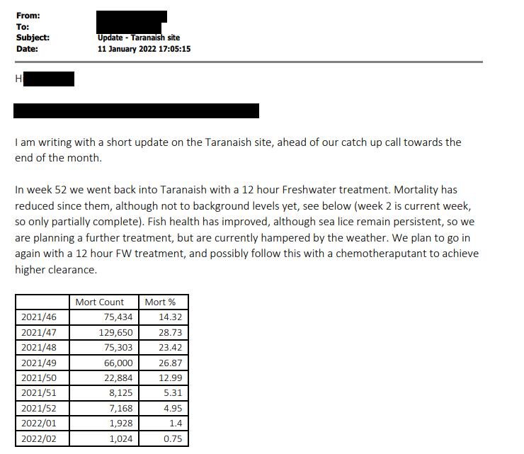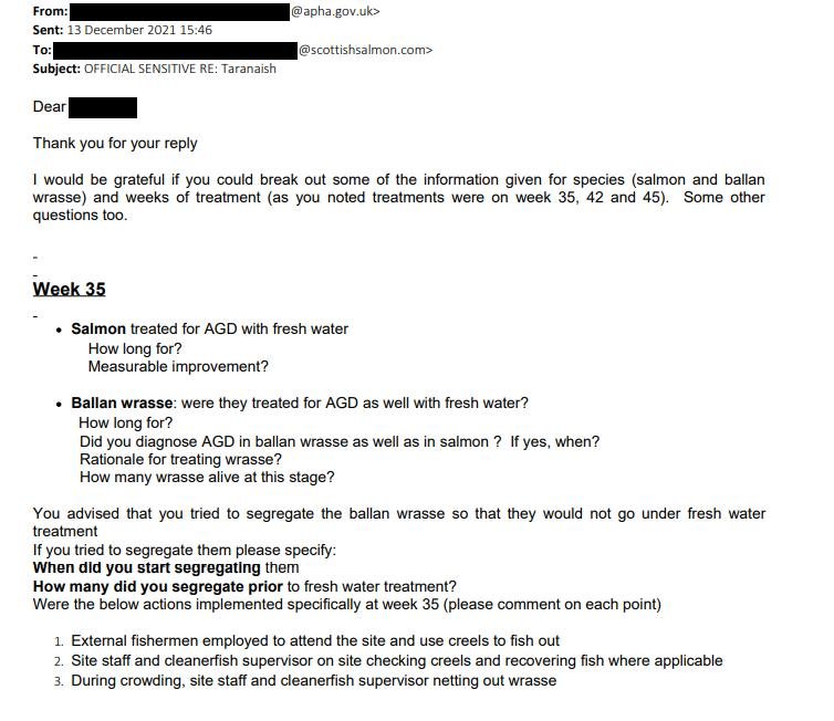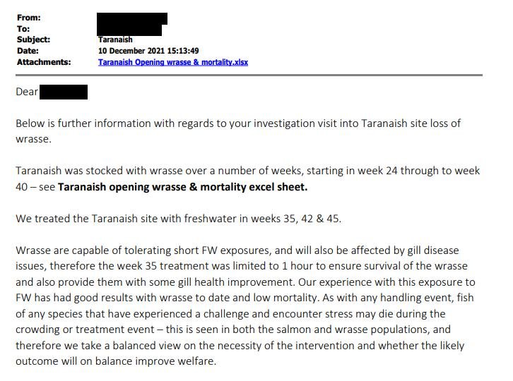 Following the Fish Health Inspectorate's visit to Taranaish salmon farm on 7 December 2021, The Scottish Salmon Company [name redacted but their phone number is 0131 718 8500 which is The Scottish Salmon Company's head office in Edinburgh] wrote to APHA on 10 December 2021 providing more information on wrasse mortalities: