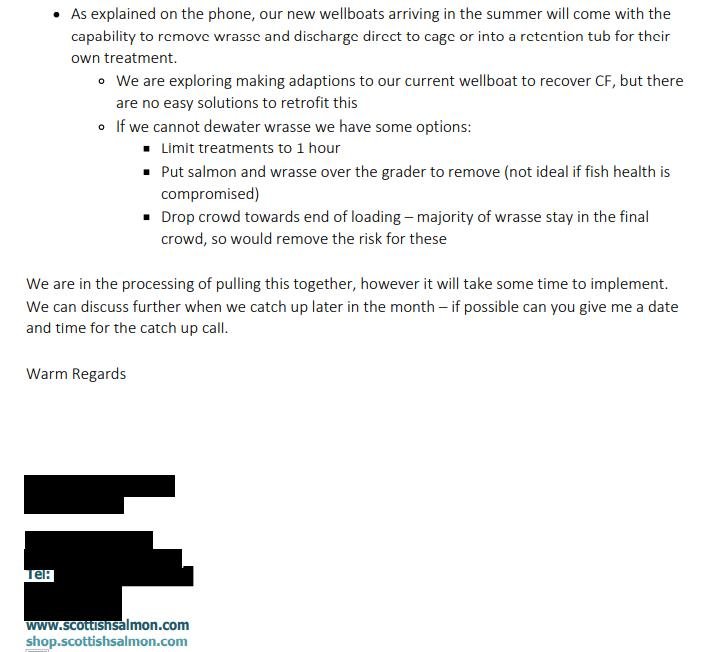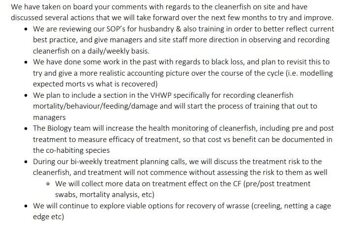 The Scottish Salmon Company wrote to APHA on 11 January 2022 outlining improvements to cleaner fish welfare: