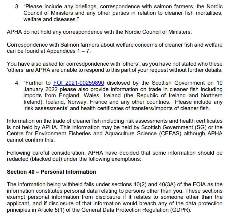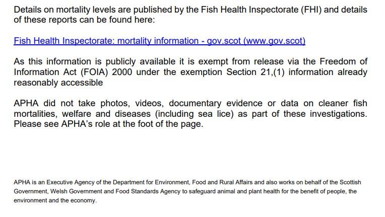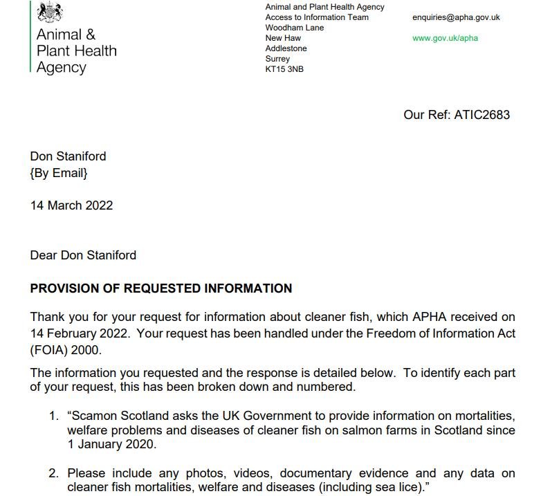 Last month (4 February 2022) Scamon Scotland wrote to the UK Government raising the issue of welfare abuse of cleaner fish on salmon farms in Scotland – here's their FOI reply dated 14 March 2022: