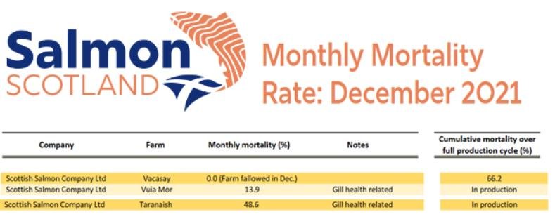 Mortality data published by Salmon Scotland reveals that Vacasay, Taranaish and Vuia Mor salmon farms in Loch Roag experienced mass mortalities in late 2021 – with Vacasay reporting a staggering 49% monthly mortality in October 2021 and 26% monthly mortality in November 2021 before harvesting out in December 2021 with a cummulative mortality of 66% whilst Taranaish reported 49% monthly mortality in December 2021 and 57% monthly mortality in November 2021 (data for January 2022 is still not published):