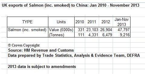 Data obtained via Freedom of Information (FOI) from the Department for the Environment, Food and Rural Affairs (DEFRA) in February 2014 reveals that exports of Scottish farmed salmon to China were 9,216 tonnes in 2013 (data up to November) representing a value of £47,797,000 compared to only 111 tonnes and £331,000 in 2010.  The increase from 2010 to 2013 (not including data for December 2013) is a staggering 8,203% by weight and 14,340% by value.