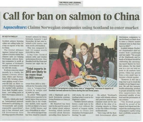The Global Alliance Against Industrial Aquaculture (GAAIA) echoed  Save Our Seals Fund's call for a ban on exports of farmed salmon to China.  Read more via today's Press & Journal: "Call for ban on salmon to China"
