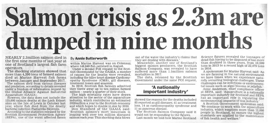 Daily Mail: “Salmon crisis as 2.3m are dumped in nine months” February 5, 2018 The Scottish Daily Mail reported (5 February 2018): Download PDF version online here More details via: Data on Mortalities & Diseases at Scottish Salmon Farms Press Release: "Scottish Salmon's Mort Mountain Leaps Over 10 Million – FOI reveals 2.3 million dead salmon at Marine Harvest farms in 2017" Photo Gallery: Dead Salmon from Scotland's Disease-Ridden Salmon Farms