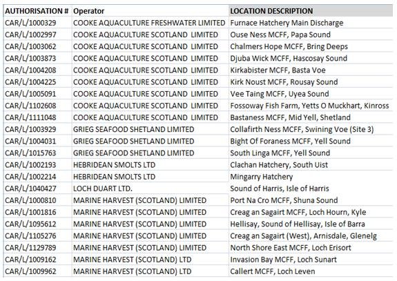 Here's the list of 42 salmon farms rated as "Poor" or "Very Poor" in 2016 – download Excel spreadsheet obtained from SEPA via Operators List