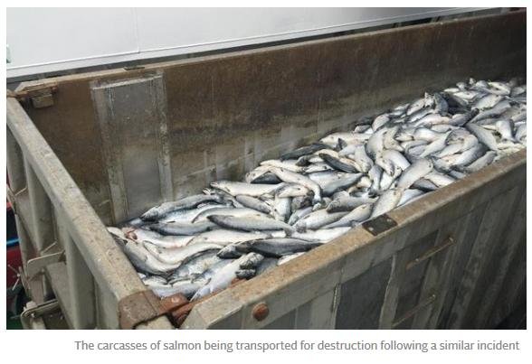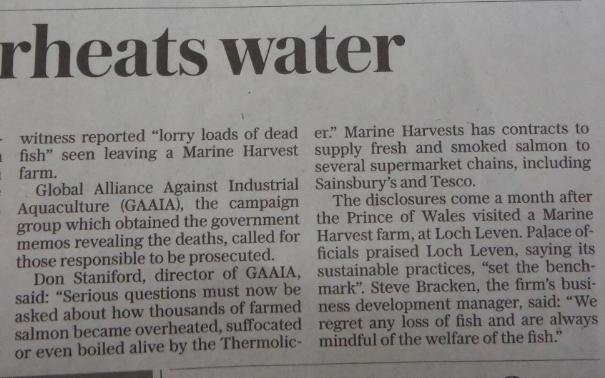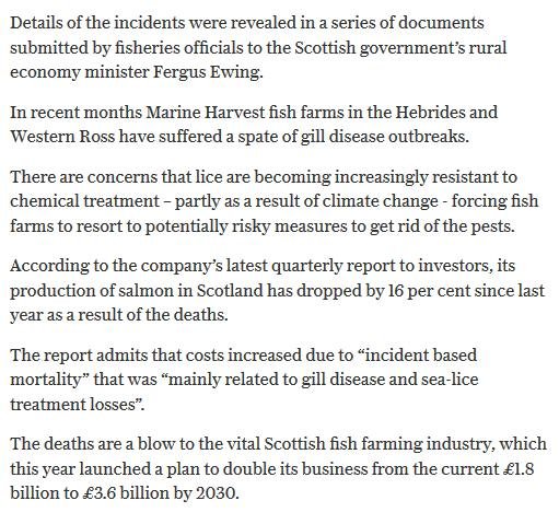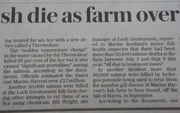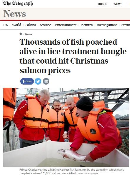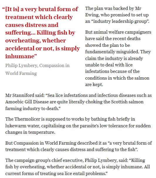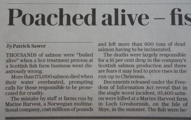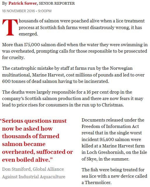 Daily Telegraph: “Poached alive – fish die as farm overheats water” November 18, 2016 The Daily Telegraph reported (19 November 2016): Here's the online version: A similar story is also reported in The Daily Mail (19 November) via: "Thousands of salmon are poached alive when a lice treatment process went horribly wrong in a mistake that could see prices soar ahead of Christmas" Read more via: Parliamentary Questions turn up the heat on The Thermolicer! Fuel the Fire-Fight Vs Farmed Salmon! Thermoliced dead salmon make waves in the media! Compassion in World Farming: "Scottish intensive salmon farming plumbs new depths" Press Release: 'Thermolicer' Back-Fires Killing 95,400 Farmed Salmon Sunday Herald: "Oops: fish farm firm kills 175,000 of its salmon by accident"