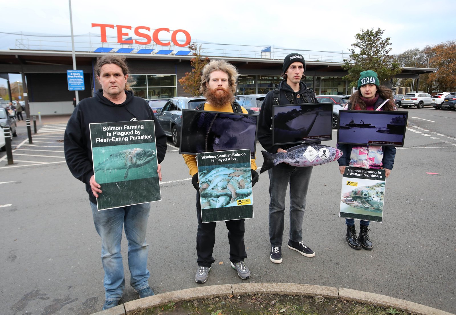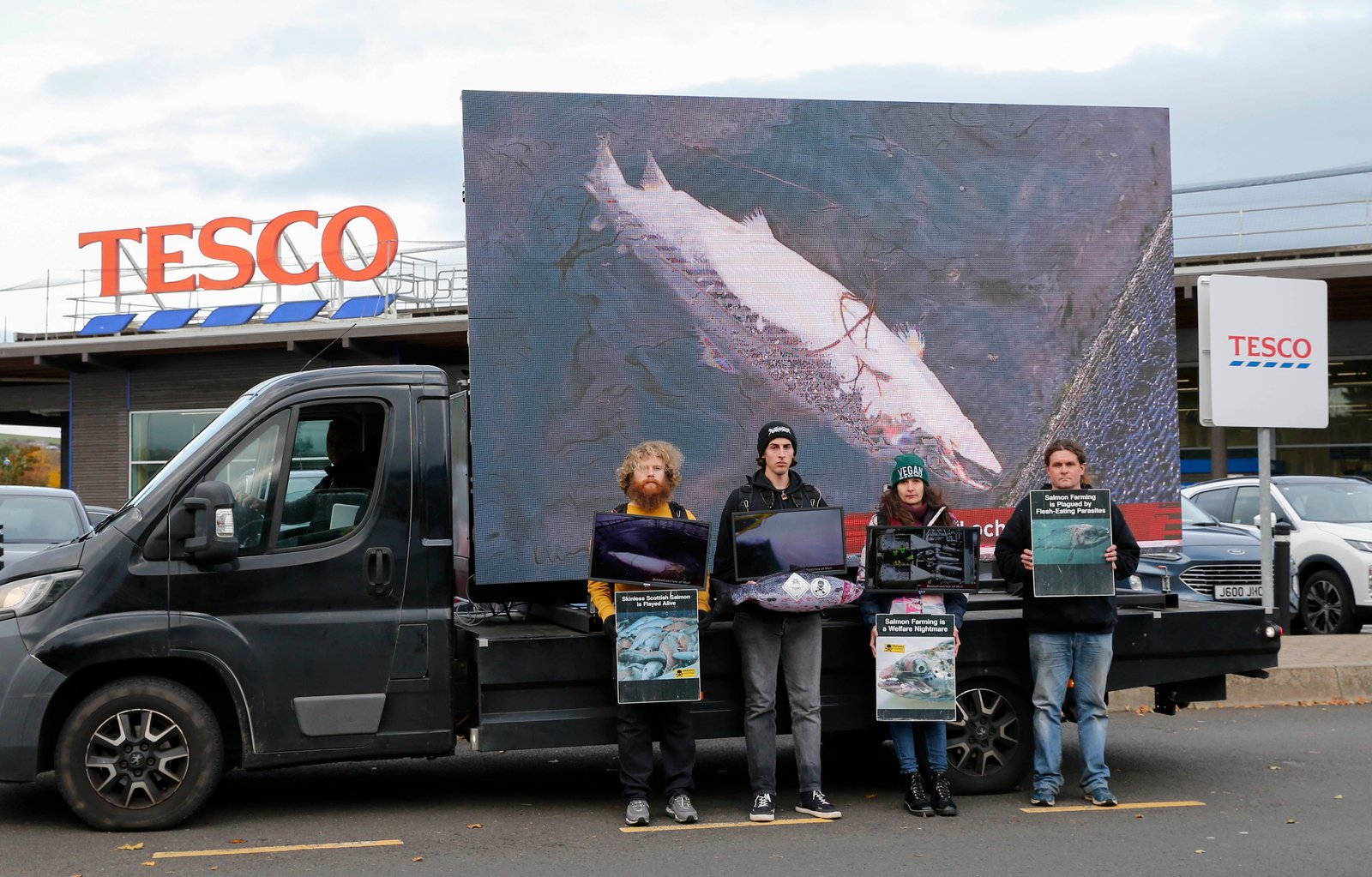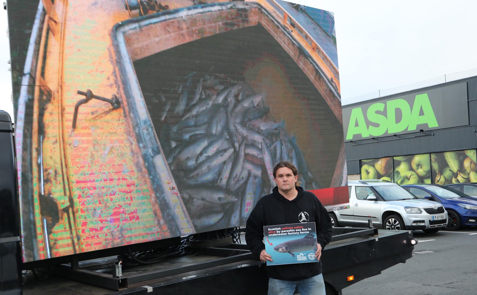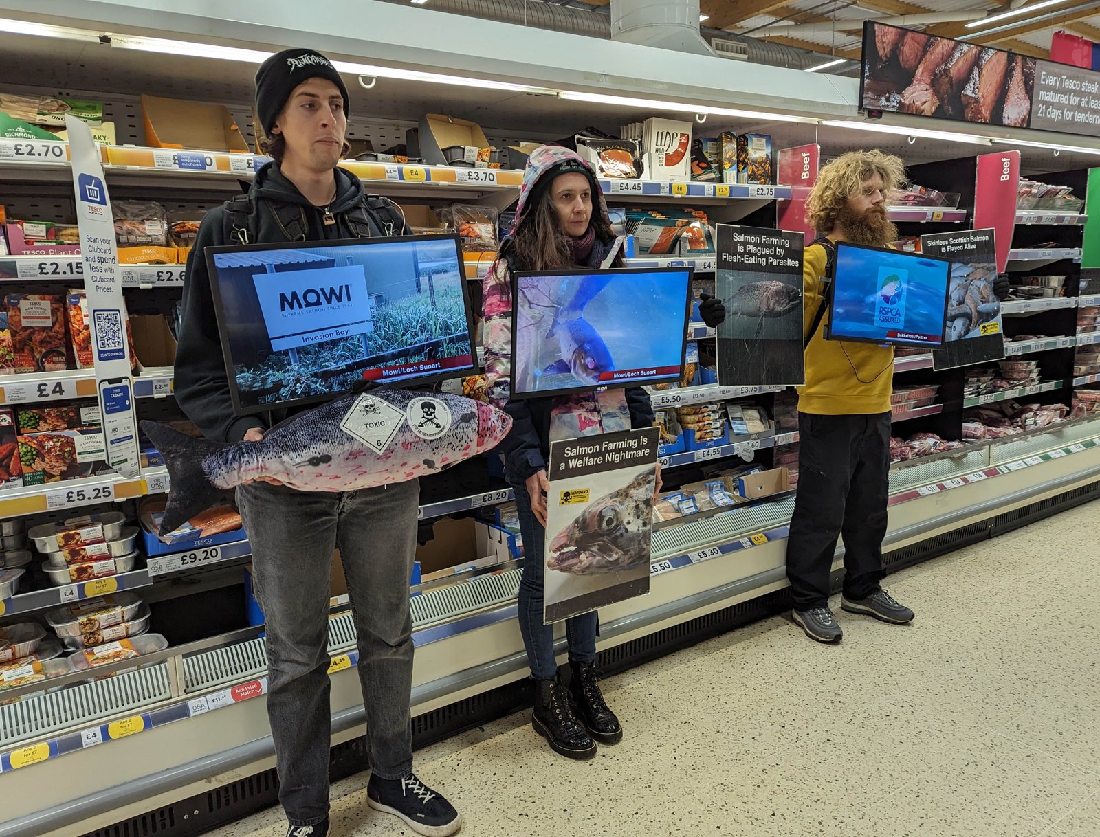 We also have three portable TV screens which are perfect to showcase the welfare nightmare of Scottish salmon inside and outside supermarkets: