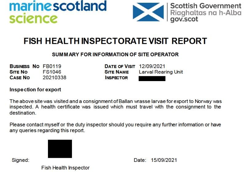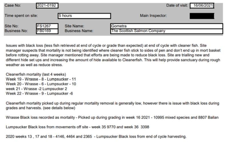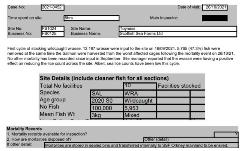 'Case Information' published by the Scottish Government's Fish Health Inspectorate for an inspection in September 2021 at Scallastle Bay (Scottish Sea Farms) reported 16,075 wild caught wrasse on site but did not provide mortality numbers (Case 2021-0325, p95-97):