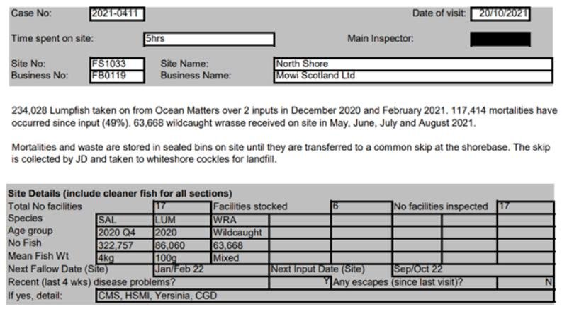 Other cases inspected in October 2021 included Mowi's North Shore salmon farm in Loch Erisort (Cases 20210390-20210430) which reported 117,414 lumpfish mortalities (49%) since two inputs in December 2020 and February 2021 (no data on mortalities of wrasse was provided):