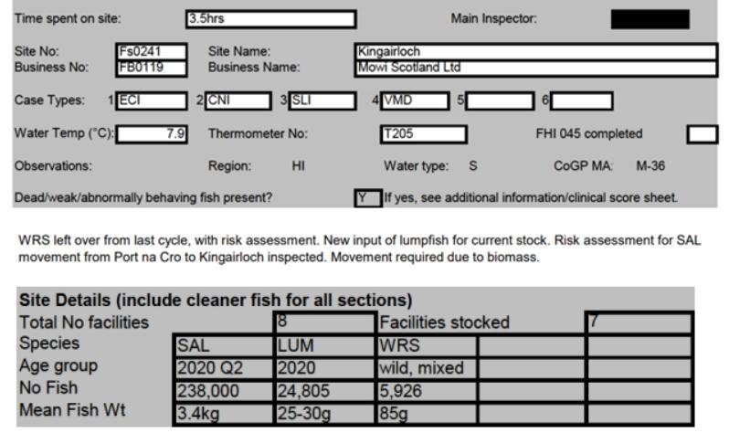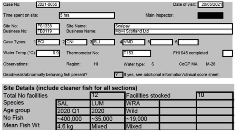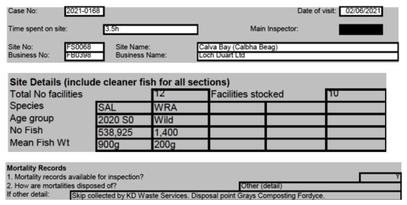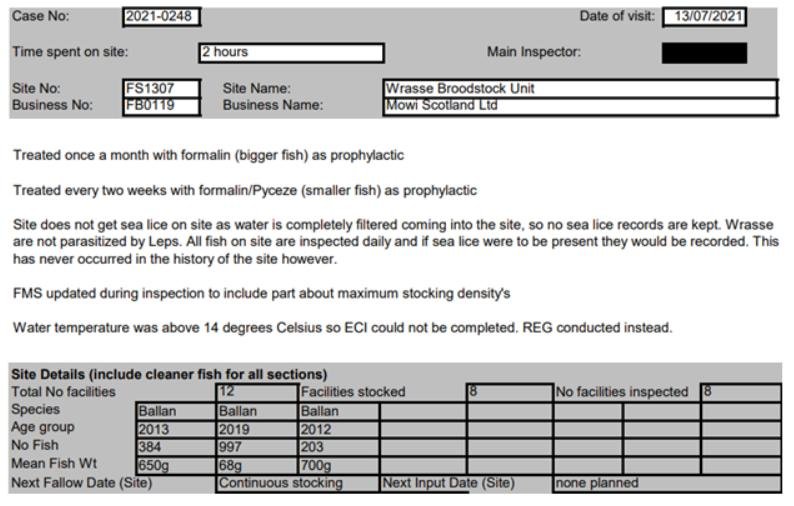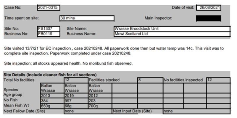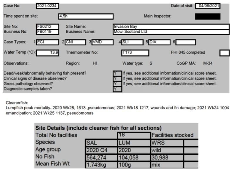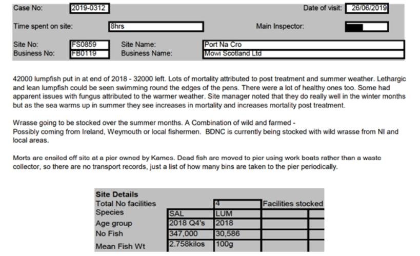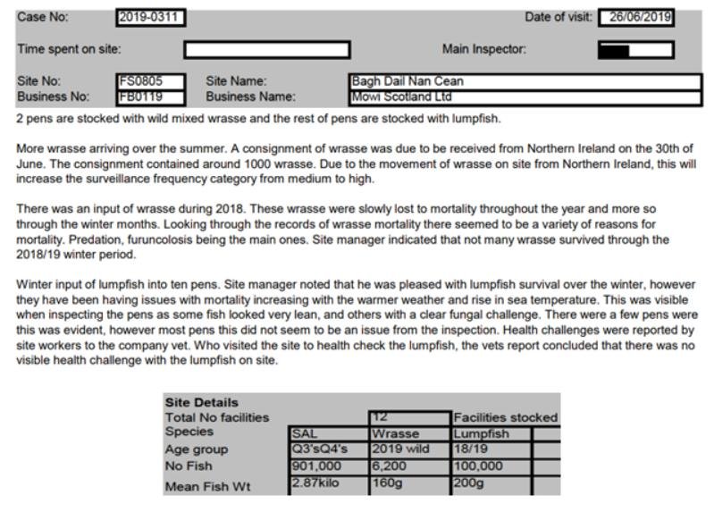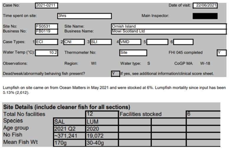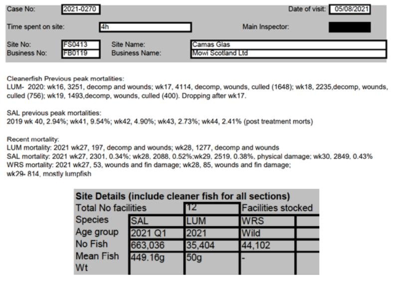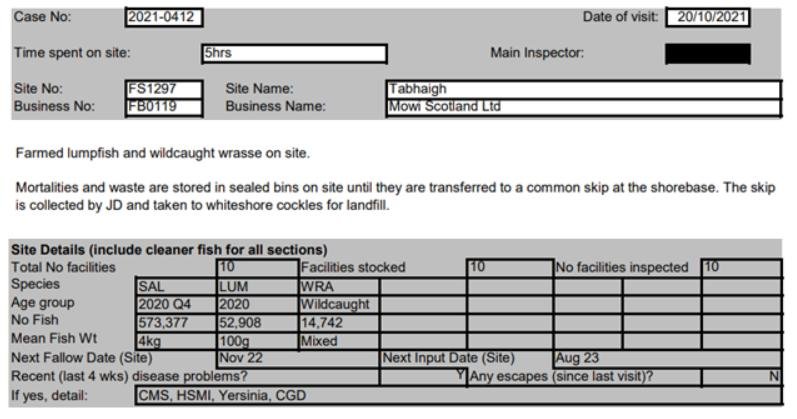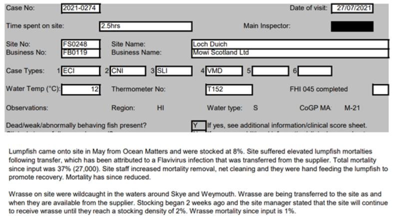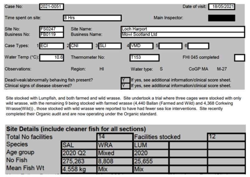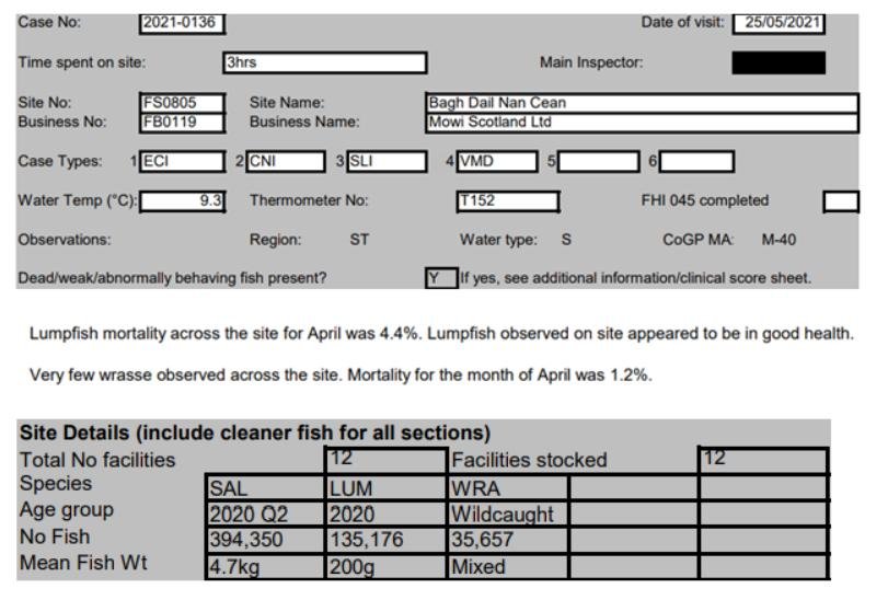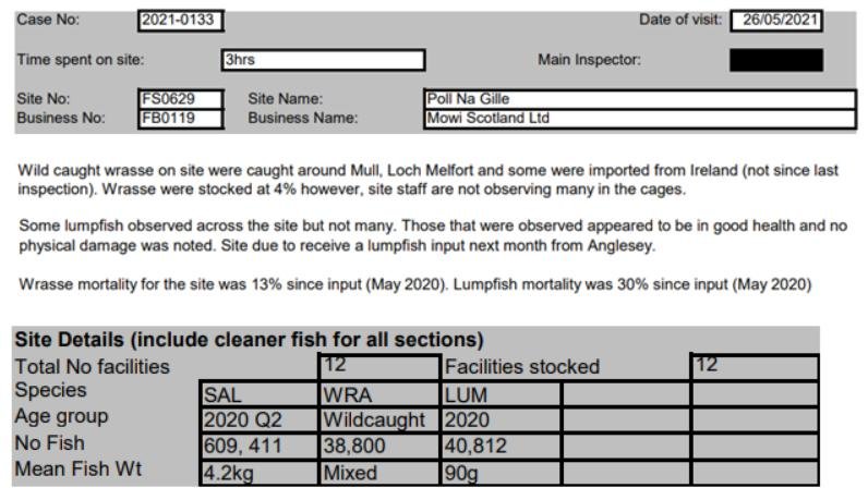 'Case Information' published by the Scottish Government's Fish Health Inspectorate for an inspection in May 2021 detailed 400,000 salmon along with 54,000 cleaner fish (10%+ stocking rate) – 35,000 lumpfish and 19,000 wild wrasse – at Mowi’s Scalpay salmon farm (no data on mortalities was provided) (Case 2021-00551, p15-17):