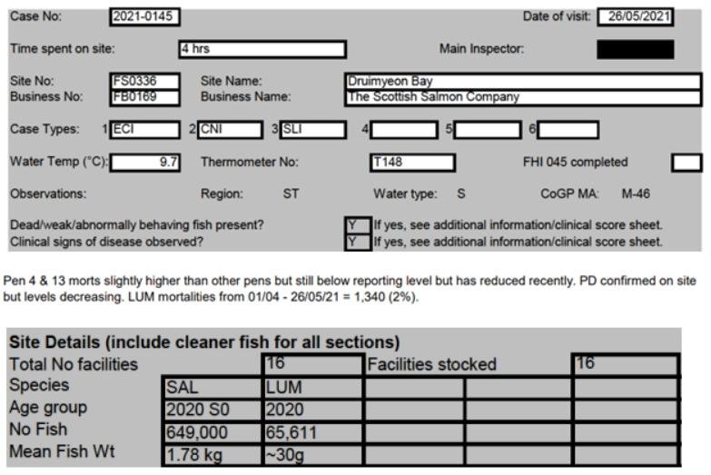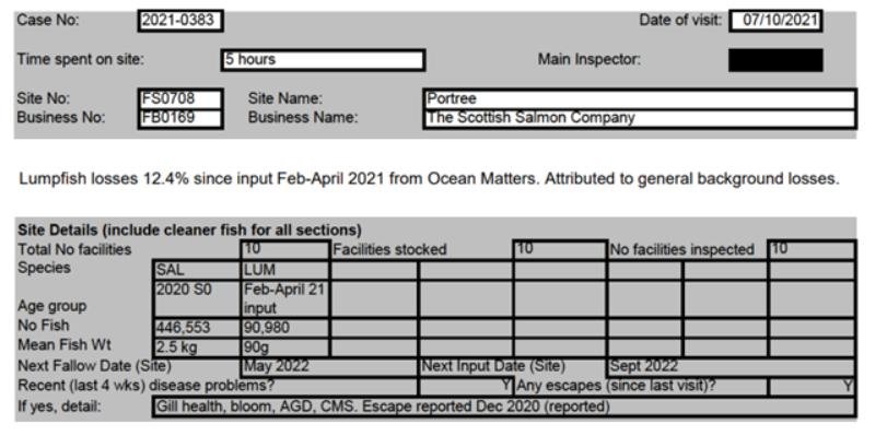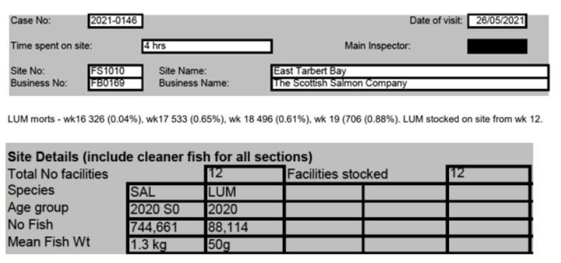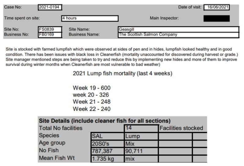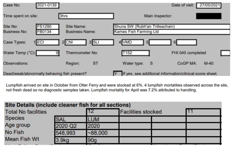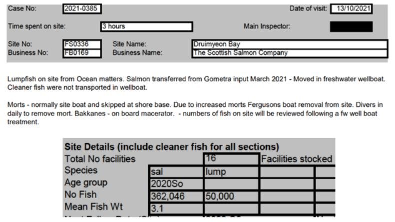 'Case Information' published by the Scottish Government's Fish Health Inspectorate for an inspection in May 2021 detailed 1,340 dead lumpfish  at The Scottish Salmon Company's Druimyeon Bay salmon farm off the Isle of Gigha with ca. 10% stocking of cleaner fish – 649,000 salmon and 65,611 lumpfish (Case 2021-0145, p1-3):