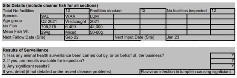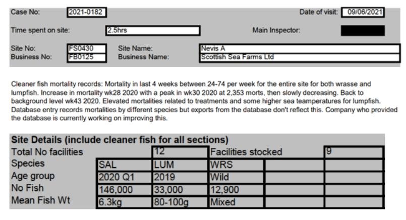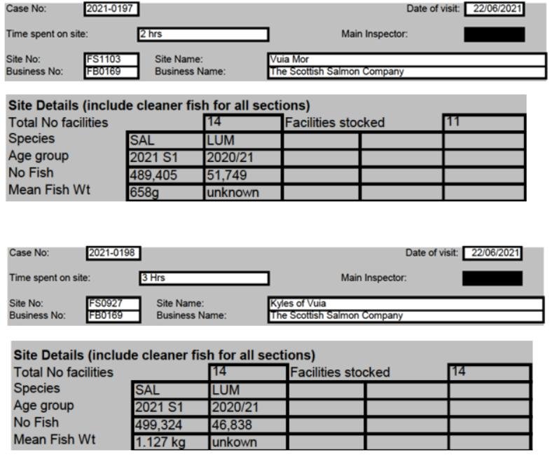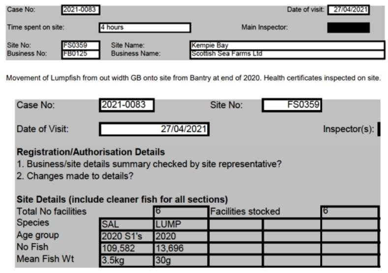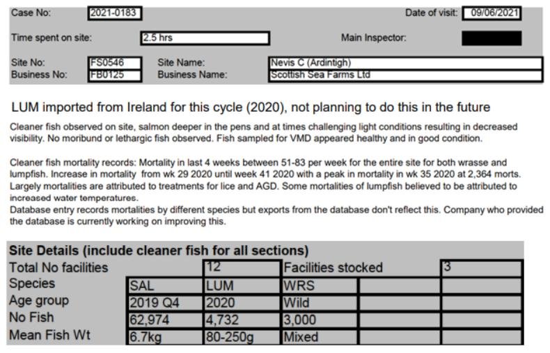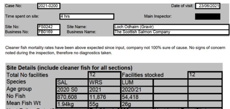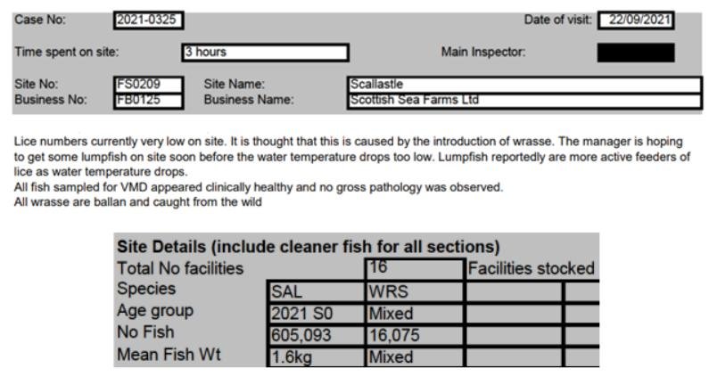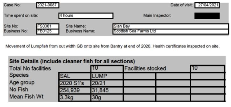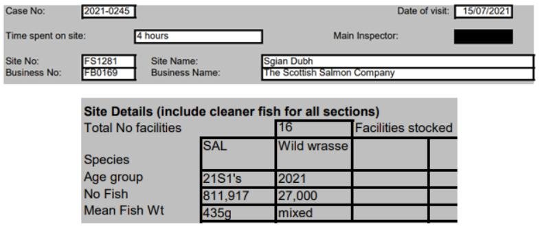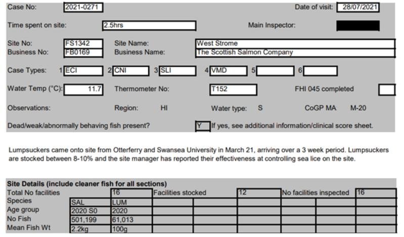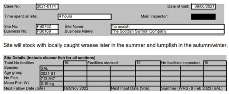 'Case Information' published by the Scottish Government's Fish Health Inspectorate for an inspection in July 2021 details 27,000 wild caught wrasse but no lumpsuckers on The Scottish Salmon Company's  Sgian Dubh salmon farm in Loch Striven with 811,917 salmon (Cases 2021-0245, p1-3):