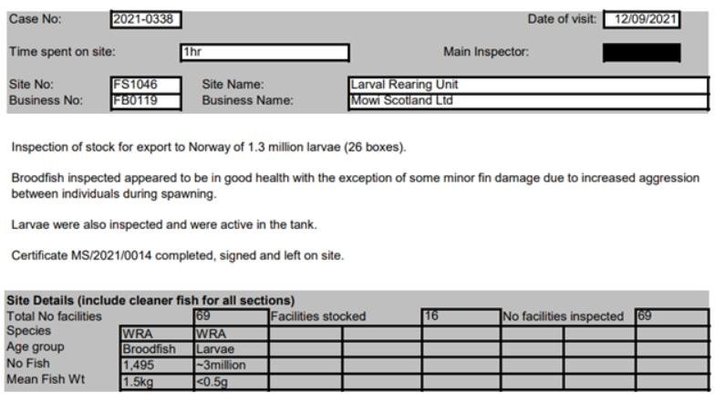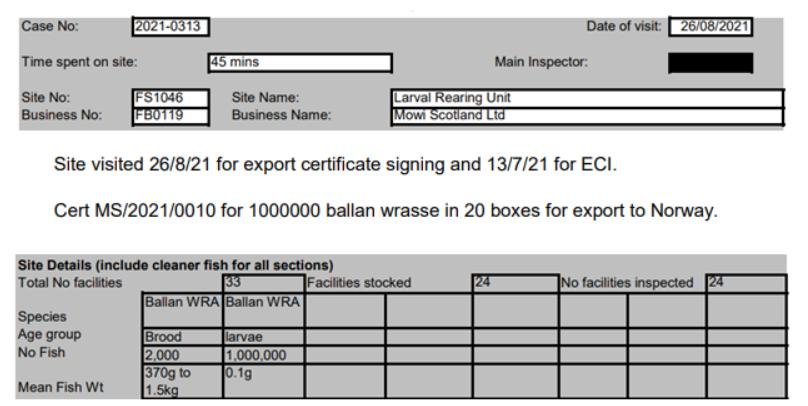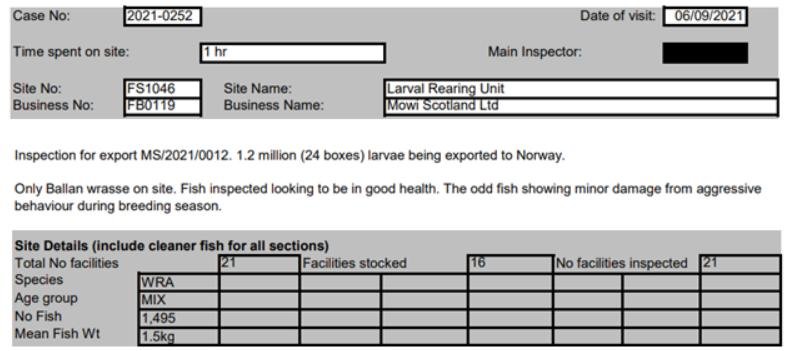 'Case Information' published by the Scottish Government's Fish Health Inspectorate for September 2021 reported 1,495 wrasse (presumably broodstock used to supply ova) at Mowi's Larval Rearing Unit at Macrihanish in Argyll (Case 2021-0252; p1-3):