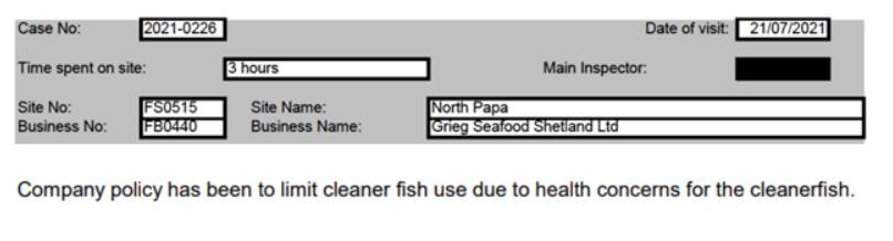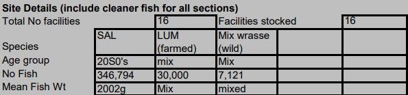The above data shows that there were 663,036 salmon on site with 35,404 farmed lumpfish and 44,102 wild wrasse – a ratio of ca. 1 cleaner fish to 9 salmon.