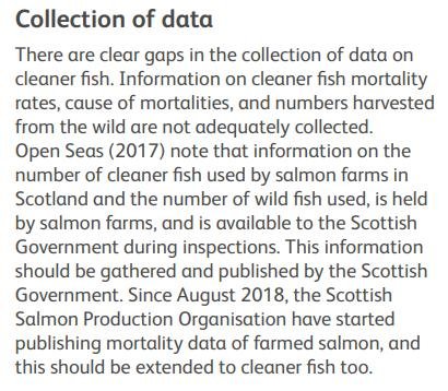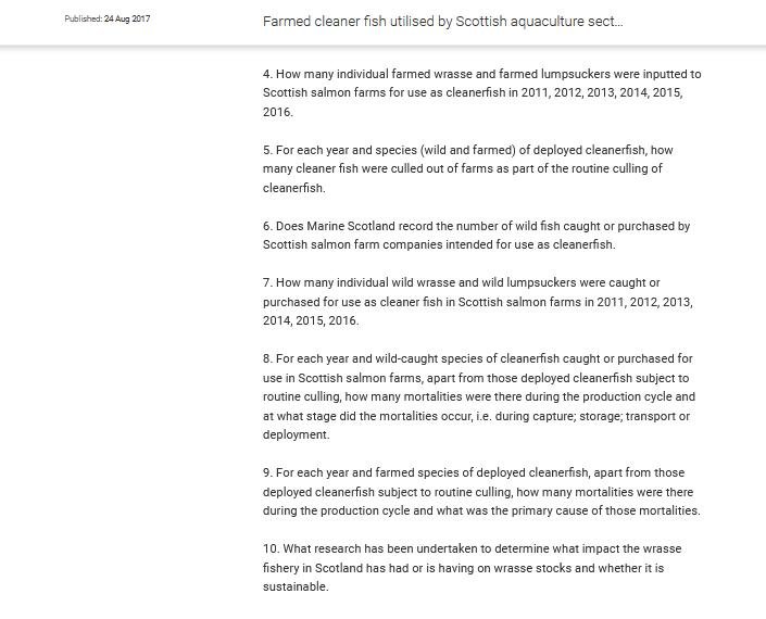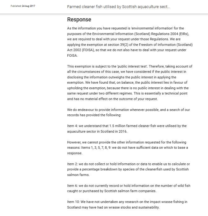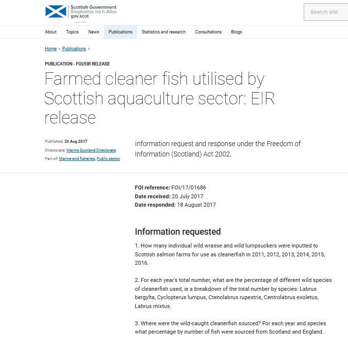 A Freedom of Information reply by the Scottish Government in August 2017 disclosed that "1.5 million farmed cleaner fish were utilised by the aquaculture sector in Scotland in 2016" but also highlighted gaps and lacks in the data: