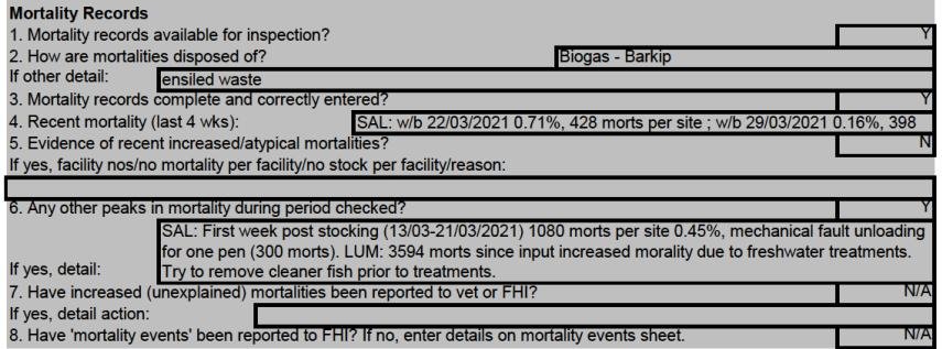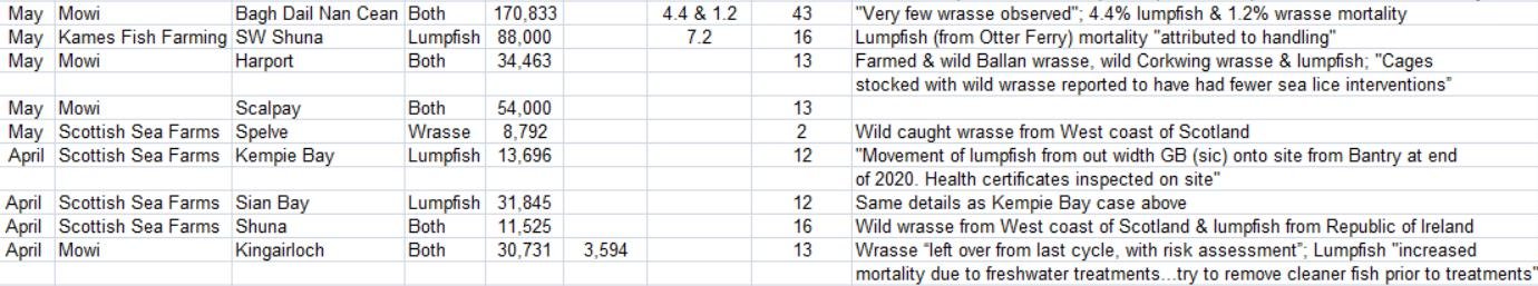 'Case Information' published by the Scottish Government's Fish Health Inspectorate for an inspection in April 2021 details wrasse “left over from last cycle, with risk assessment” and a “new input of lumpfish for current stock” at Mowi's Kingairloch salmon farm.  Cleaner fish stocking was over 10% with 238,000 salmon; 24,805 lumpfish and 5,926 mixed wild wrasse (Cases 2021-0058, p1-3).   Mortality records detailed 3,594 lumpfish morts since input with “increased mortality due to freshwater treatments” and the note that the farm “try to remove cleaner fish prior to treatments” (freshwater and mechanical treatments can kill cleaner fish).