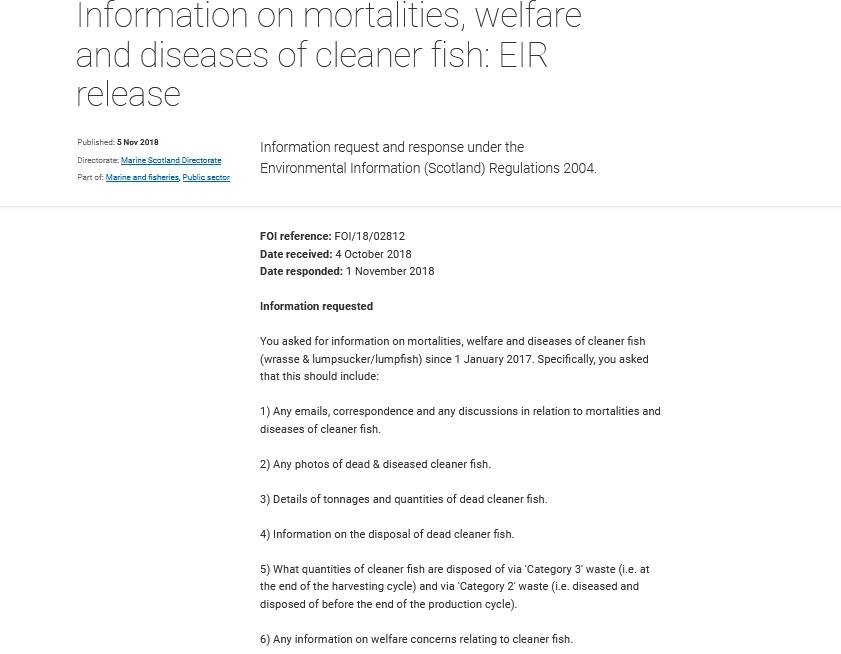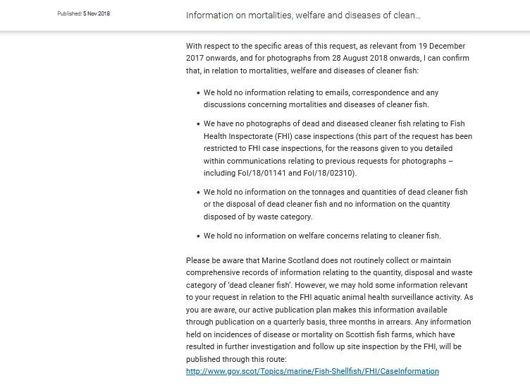 Another FOI reply by the Scottish Government in November 2018 revealed an abject lack of information on cleaner fish mortalities and disposal of dead fish:
