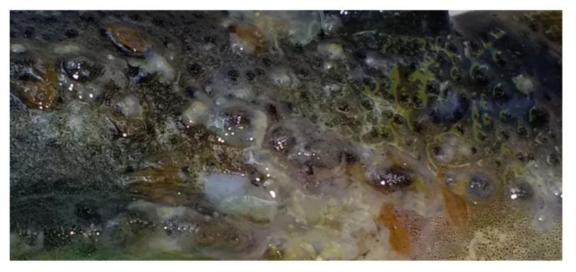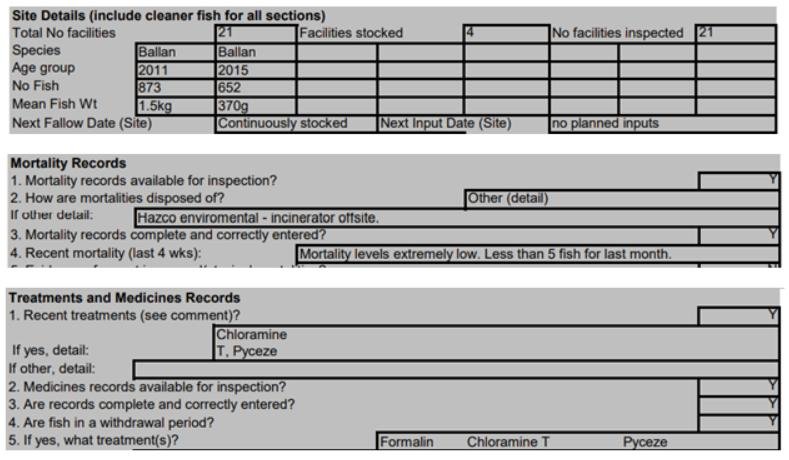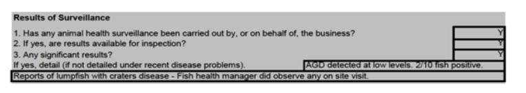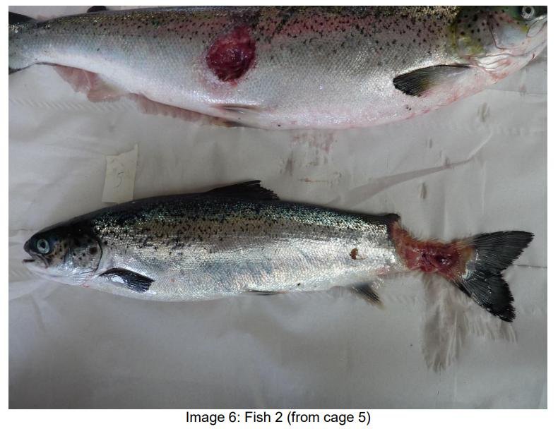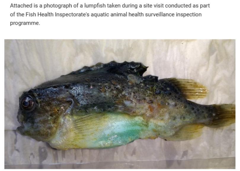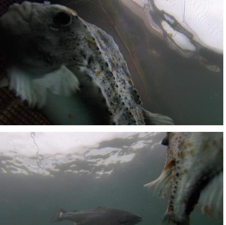 No data on mortalities, diseases or welfare problems in cleaner fish were provided but photos of diseased salmon – which tested positive for Infectious Salmon Anaemia virus – show serious issues on site.