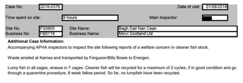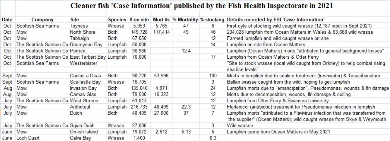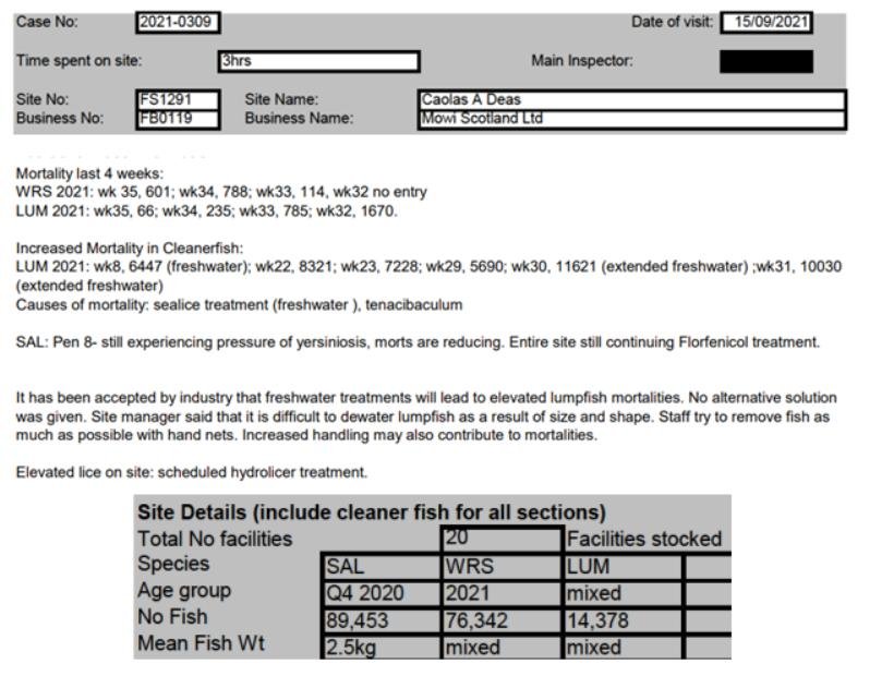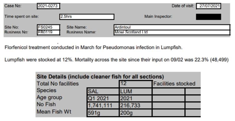 'Case Information' published by the Scottish Government's Fish Health Inspectorate for an inspection in September 2021 revealed 788 wrasse morts in Week 34 and 1,670 lumpfish morts in Week 32 (Case 2021-0309, p7-9) due to freshwater treatments and Tenacibaculum with 76,342 wrasse and 14,378 lumpfish on site at Mowi's ASC-audited Caolas a Deas salmon farm in Loch Shell: