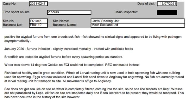 'Case Information' published by the Scottish Government's Fish Health Inspectorate for an inspection in July 2021 details (Case 2021-0247, p29-33) Furunculosis in one broodstock wrasse with Furunculosis infection causing "slightly increased mortality" treated with antibiotics and the use of the carcinogenic chemical Formaldehyde (Formalin), Chloramine T disinfectant and Pyceze (Bronopol) at Mowi's Larval Rearing Unit at Macrihanish in Argyll: