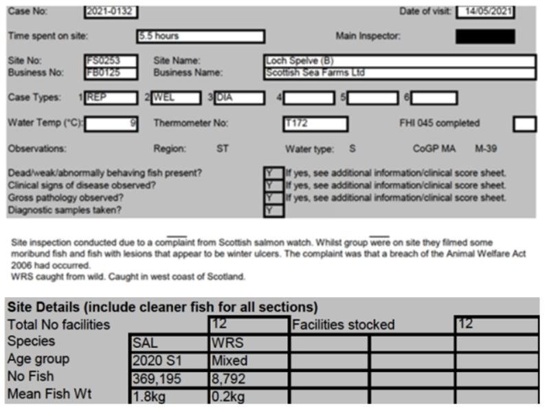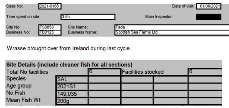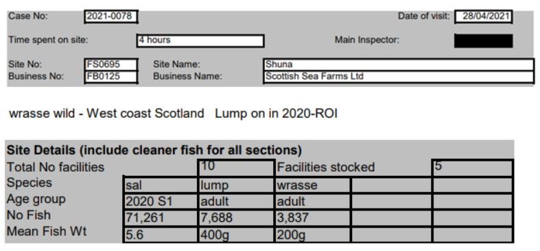 'Case Information' published by the Scottish Government's Fish Health Inspectorate for an inspection in May 2021 detailed 8,792 wild wrasse “caught in west coast of Scotland” with a stocking rate well below 10% (369,195 salmon and 8,792 wrasse) at Loch Spelve salmon farm operated by Scottish Sea Farms (Cases 2021-0132, p78-80).
