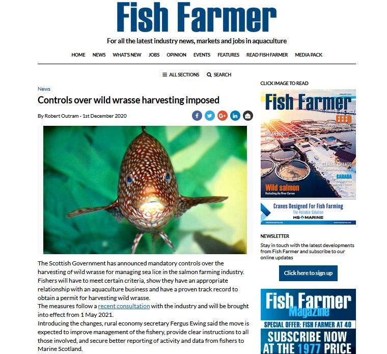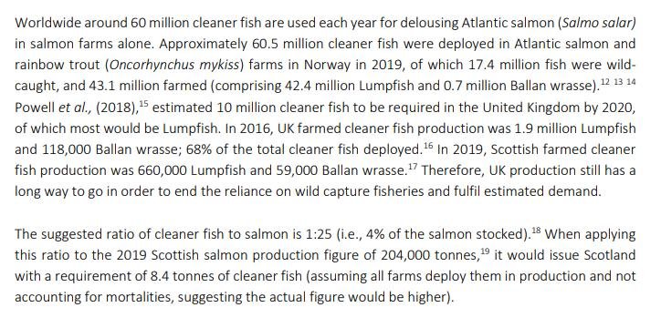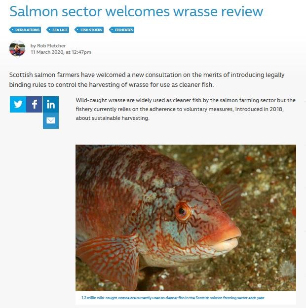 The Fish Site reported in May 2020 that 1.2 million wild caught wrasse were used each year on salmon farms in Scotland.
