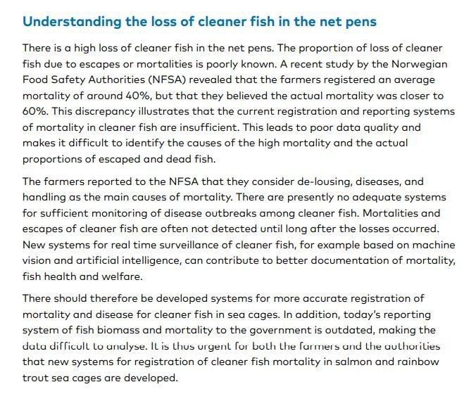 The above data shows that for 564,274 salmon on site there were 104,058 lumpfish and 30,988 wrasse – a ratio of ca. 1 cleaner fish per 4 salmon.